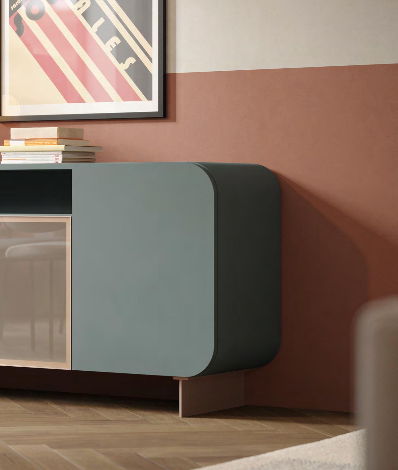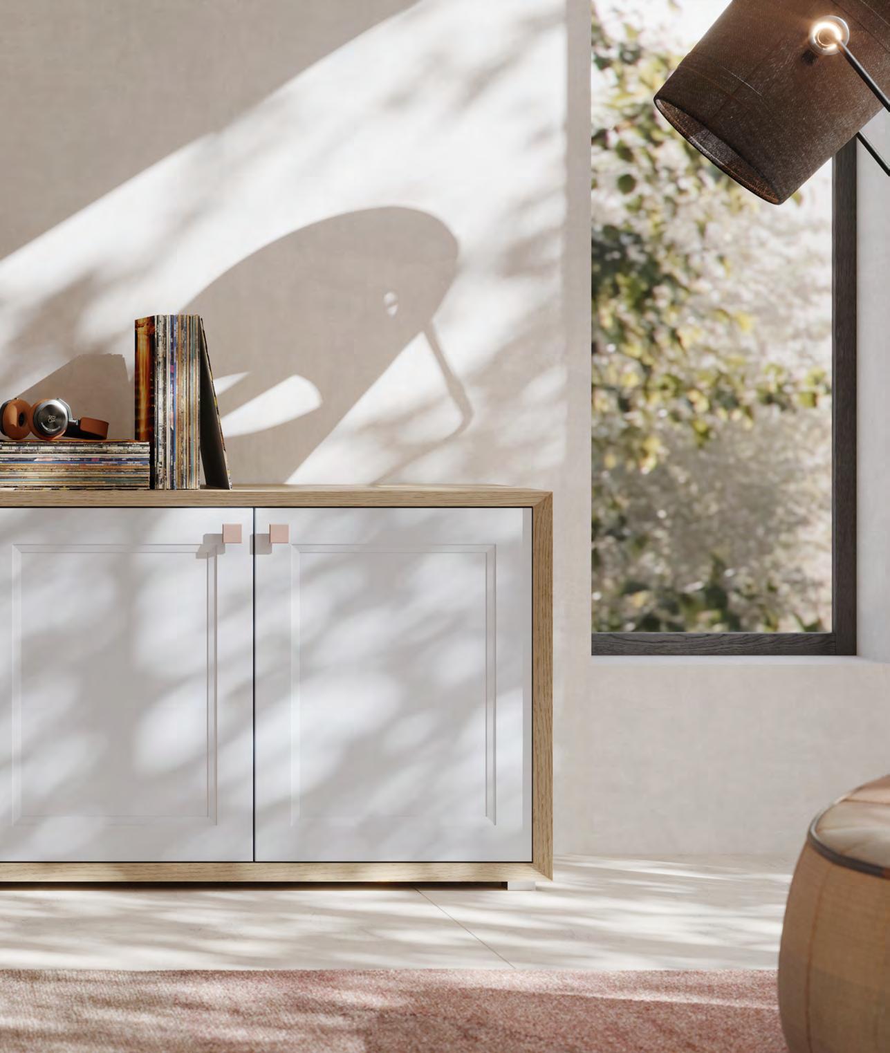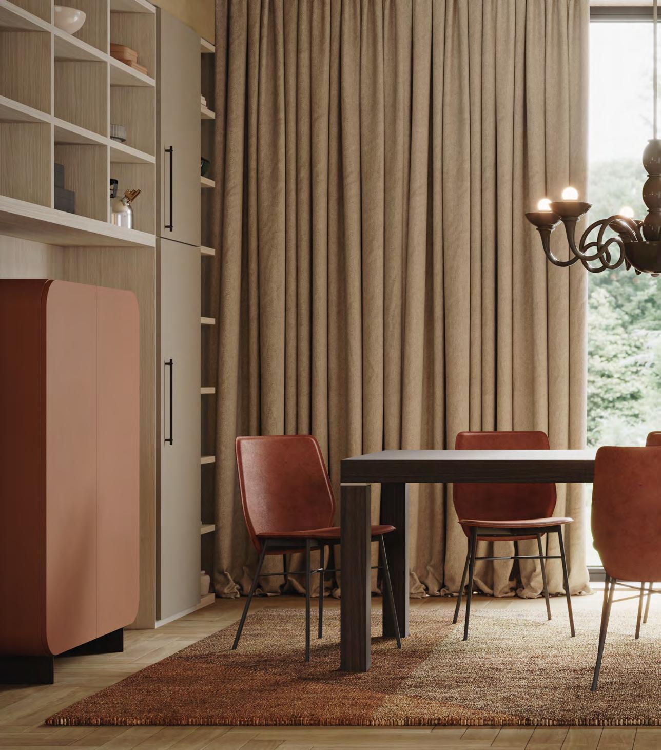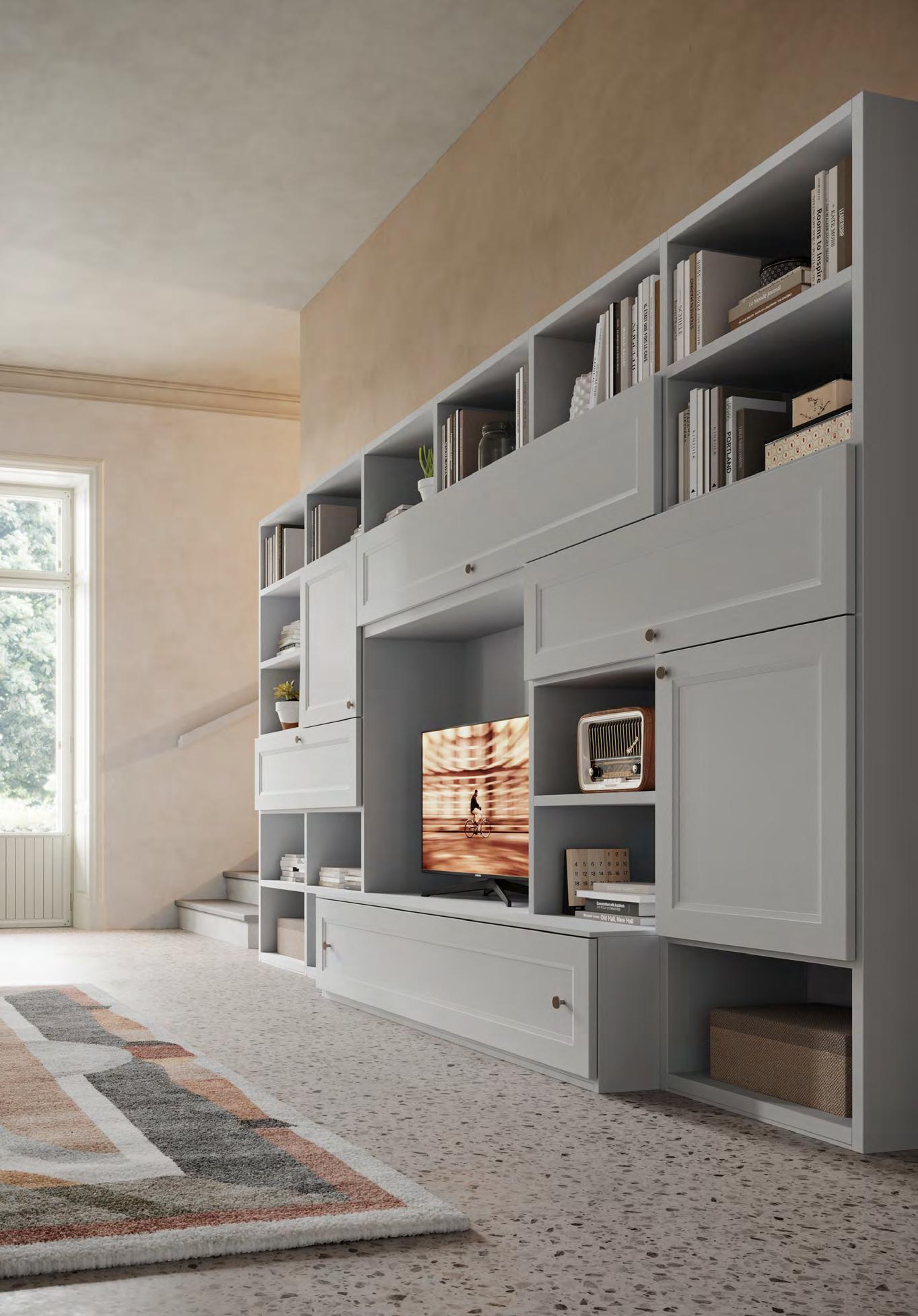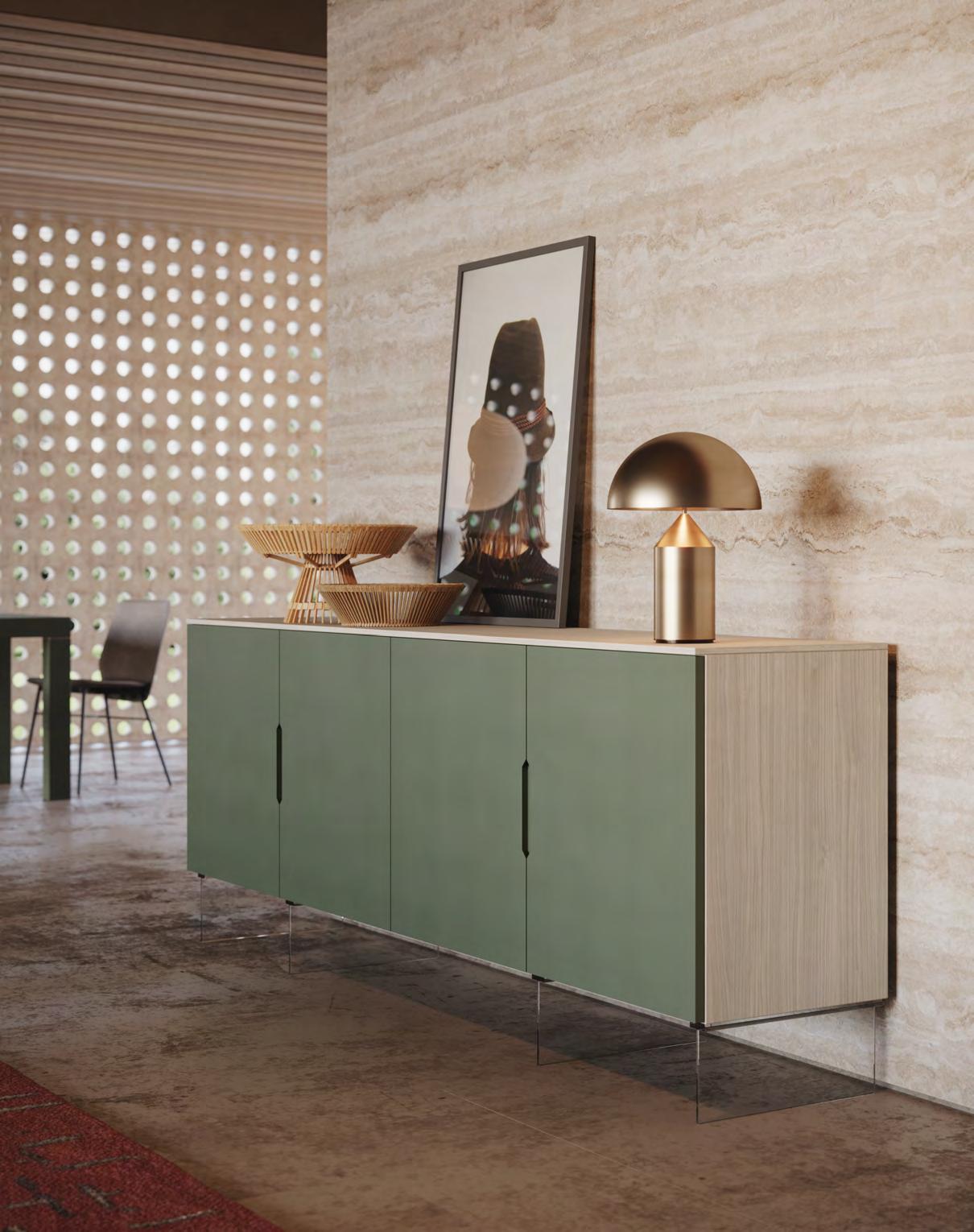 Ma il Living 2024 si impreziosisce soprattutto di finiture e colori: una palette di laccati più ispirata alla natura, che evoca sensazioni di tranquillità e pace; diverse nuove finiture vetro a scelta tra gli eleganti Canova e Sahara Noir effetto marmo, il Bronzo satinato dall’aspetto caldo e vellutato ed il cannettato Flutes Grigio scuro; tra i nuovi nobilitati introdotti spiccano invece Michelangelo e Marquinia che richiamano l’eleganza del marmo ed il Corten effetto ruggine; infine il nuovo color Rame introdotto per tutti gli accessori metallici che, affiancandosi ai preesistenti Brown e Champagne, aggiunge una nota di calore alle trame dei nostri vissuti.