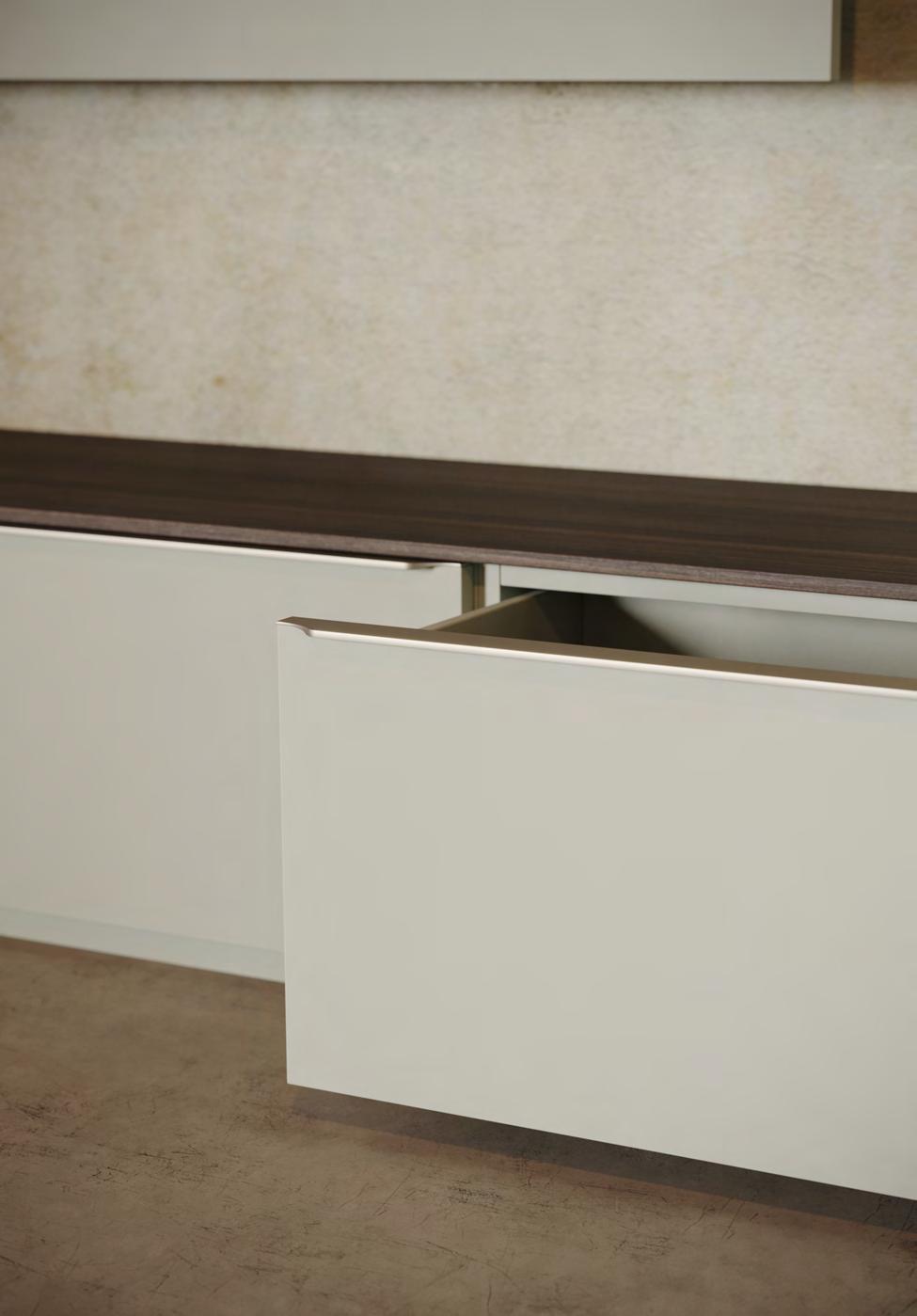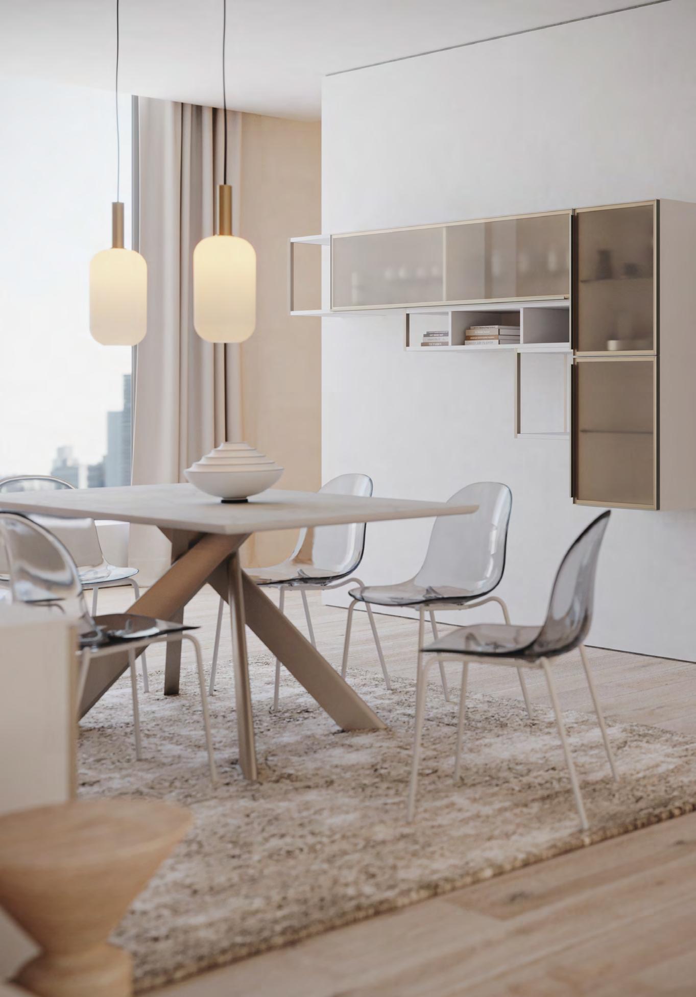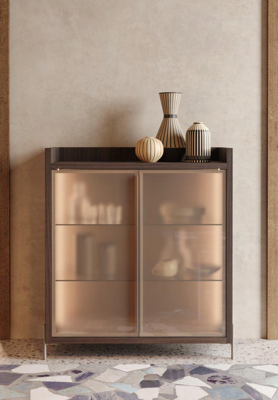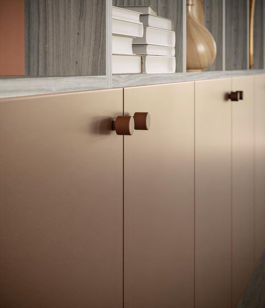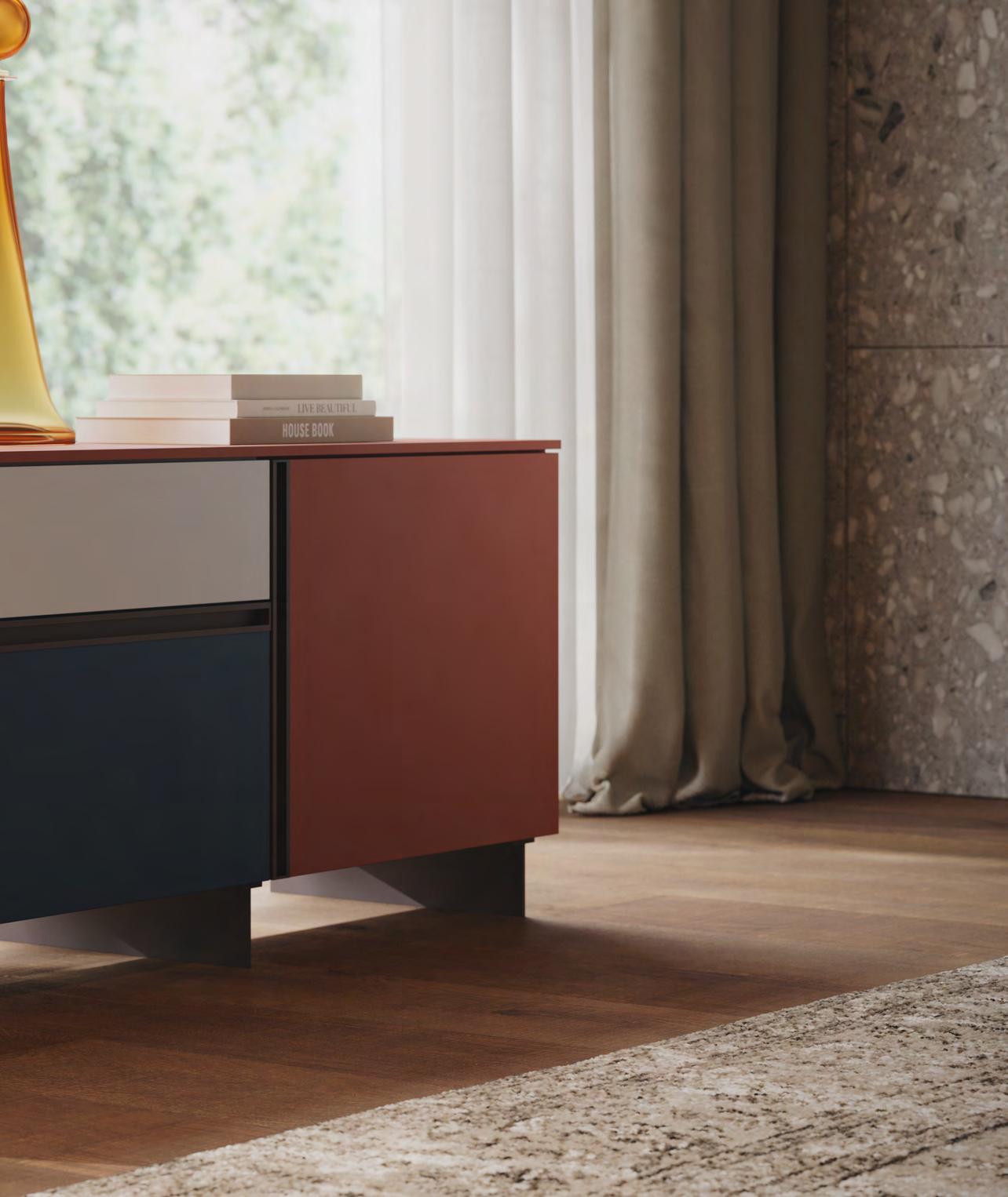 Ma il Living 2024 si impreziosisce soprattutto di finiture e colori: una palette di laccati più ispirata alla natura, che evoca sensazioni di tranquillità e pace; diverse nuove finiture vetro a scelta tra gli eleganti Canova e Sahara Noir effetto marmo, il Bronzo satinato dall’aspetto caldo e vellutato ed il cannettato Flutes Grigio scuro; tra i nuovi nobilitati introdotti spiccano invece Michelangelo e Marquinia che richiamano l’eleganza del marmo ed il Corten effetto ruggine; infine il nuovo color Rame introdotto per tutti gli accessori metallici che, affiancandosi ai preesistenti Brown e Champagne, aggiunge una nota di calore alle trame dei nostri vissuti.