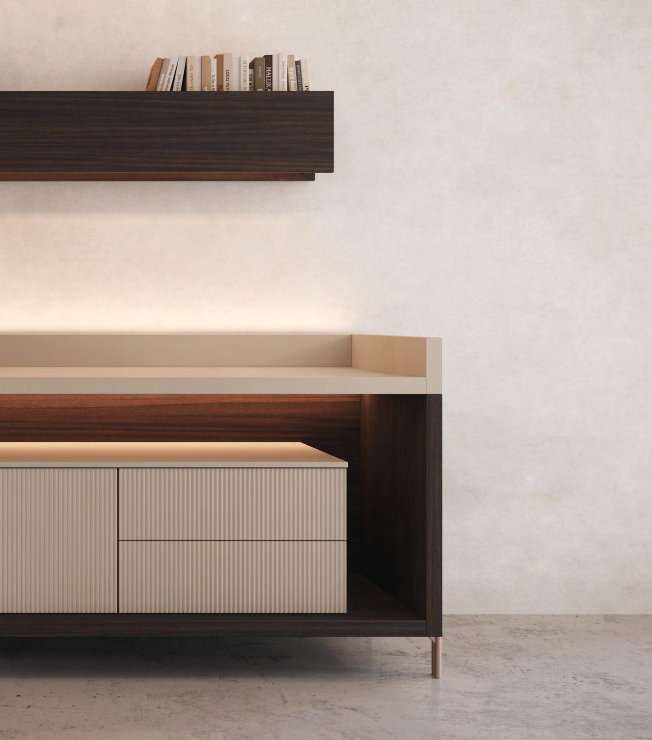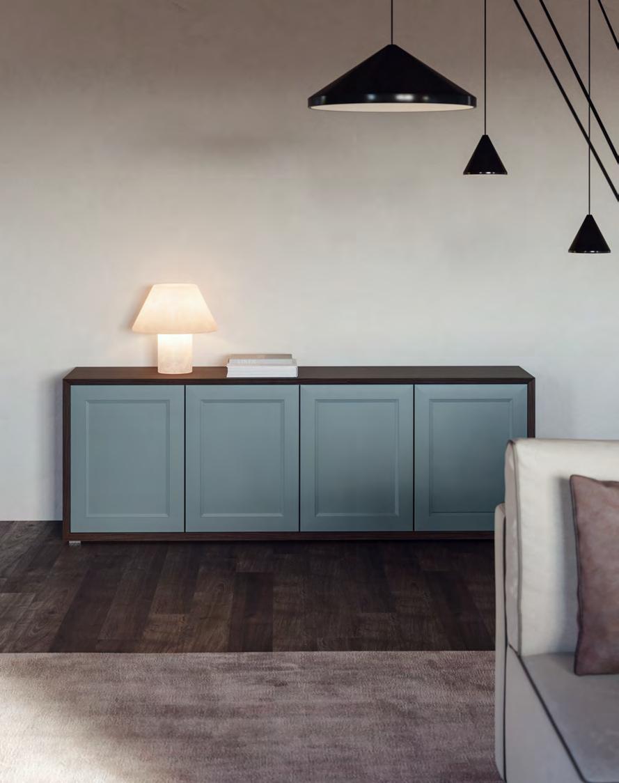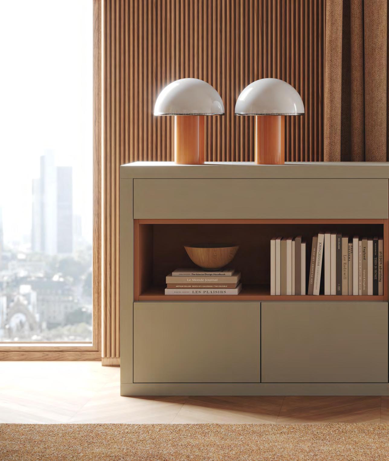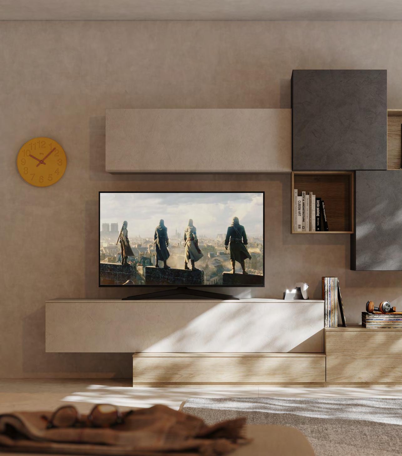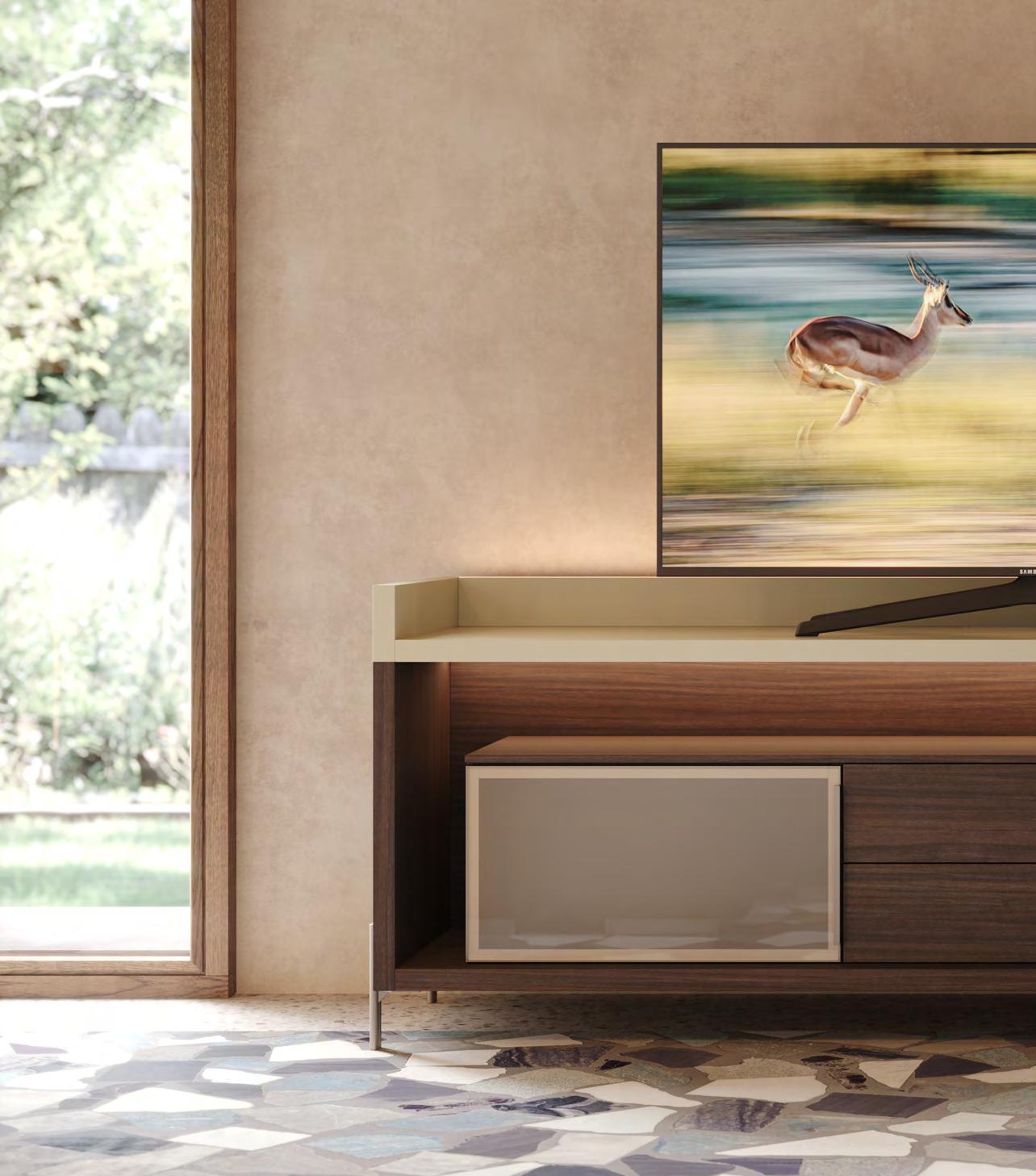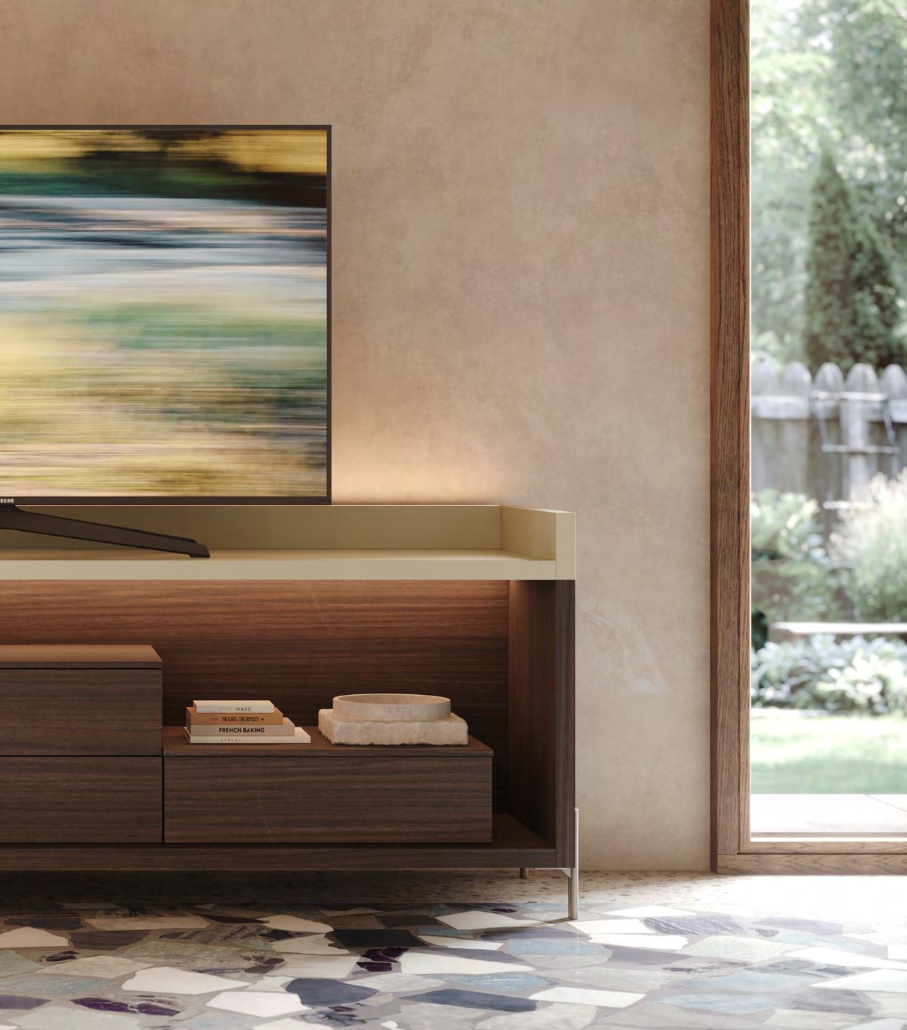 Ma il Living 2024 si impreziosisce soprattutto di finiture e colori: una palette di laccati più ispirata alla natura, che evoca sensazioni di tranquillità e pace; diverse nuove finiture vetro a scelta tra gli eleganti Canova e Sahara Noir effetto marmo, il Bronzo satinato dall’aspetto caldo e vellutato ed il cannettato Flutes Grigio scuro; tra i nuovi nobilitati introdotti spiccano invece Michelangelo e Marquinia che richiamano l’eleganza del marmo ed il Corten effetto ruggine; infine il nuovo color Rame introdotto per tutti gli accessori metallici che, affiancandosi ai preesistenti Brown e Champagne, aggiunge una nota di calore alle trame dei nostri vissuti.