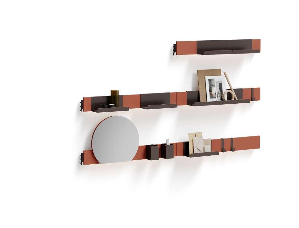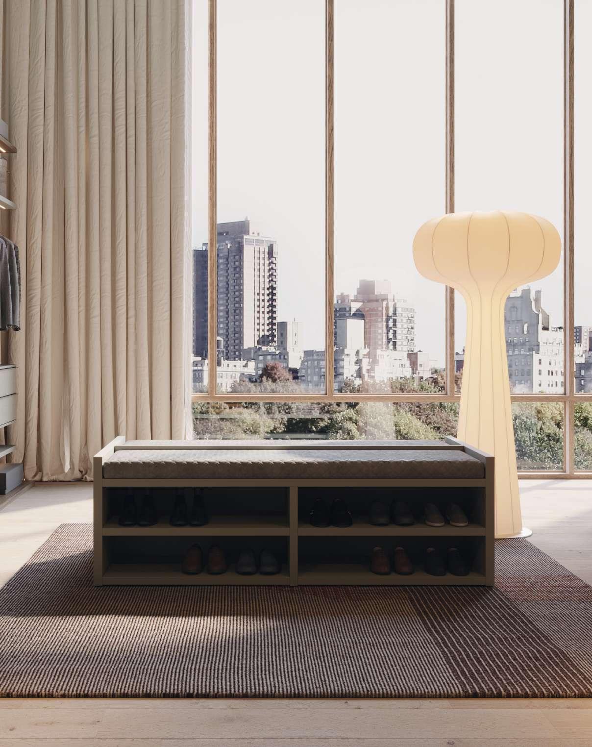 Al centro stanza, invece, è stata posta una panca scarpiera con uno scaffale porta oggetti terminale. Alcuni complementi della composizione sono proposti in laccato Brick, col fine di dare un tocco energizzante e più giovanile all'ambiente, senza compromettere il lavoro armonico dell'intero ambiente.