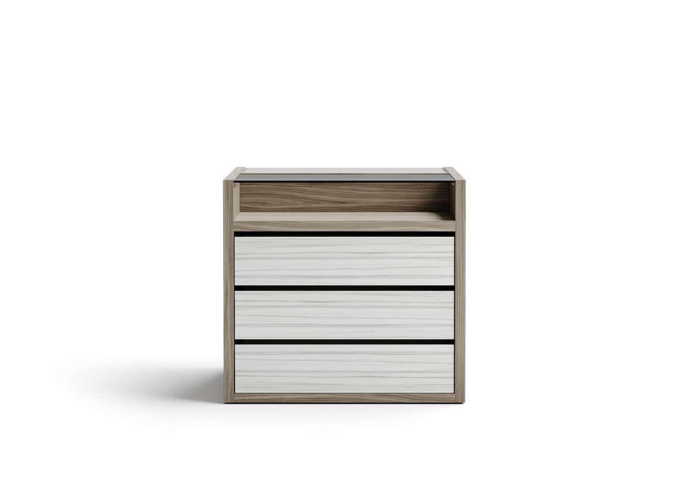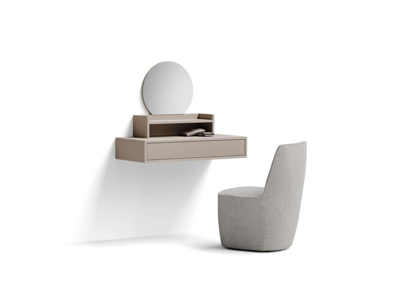 Protagonista è la zona trucco centrale che, con cassetti effetto cannetè ed alzatina con specchio, ha le sembianze di un vero e proprio camerino da teatro, quel luogo di confine che assiste alla metamorfosi del trucco e della vestizione, accoglie confidenze, battute, ansia e liberazione. Il colore laccato Fenix Seta dona all'ambiente luminosità ed un fascino fresco e puro, quasi di eterna giovinezza. A fare da contorno due comò Bridge, un letto Nubes ed un comodino Riva della Collezione Night.