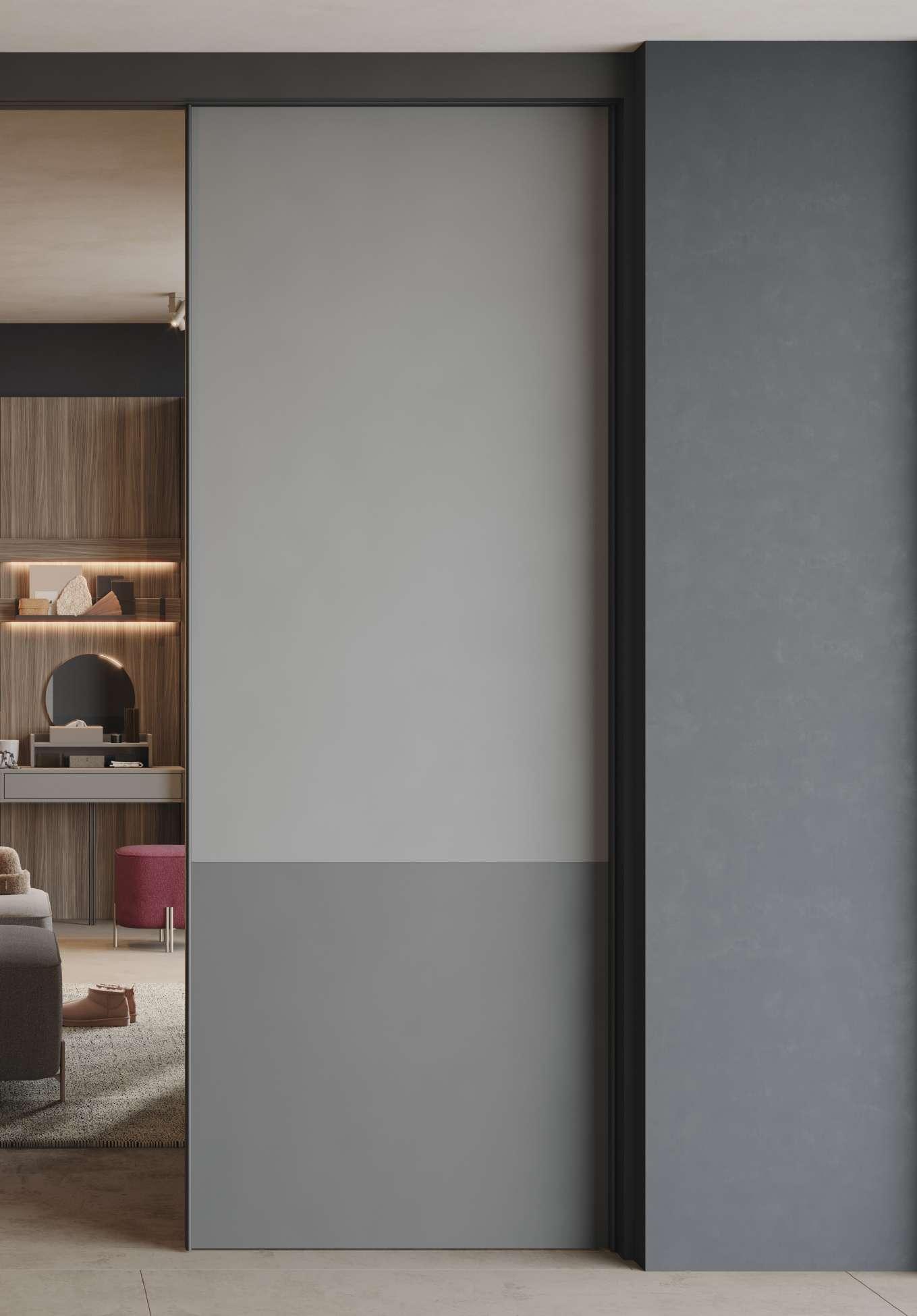 A fare da ingresso una porta scorrevole con telaio in alluminio verniciato Grafite e vetri Reflex.