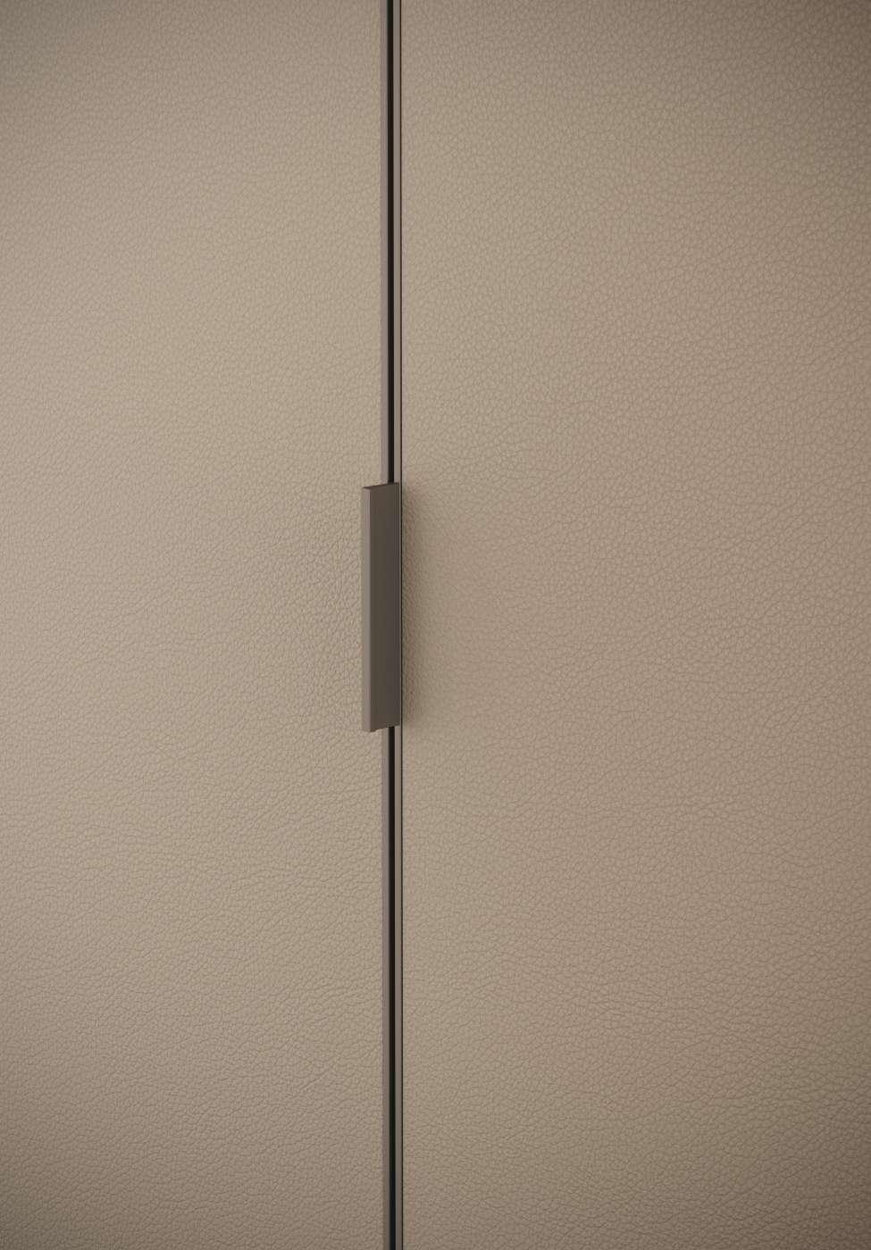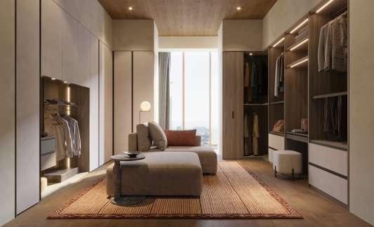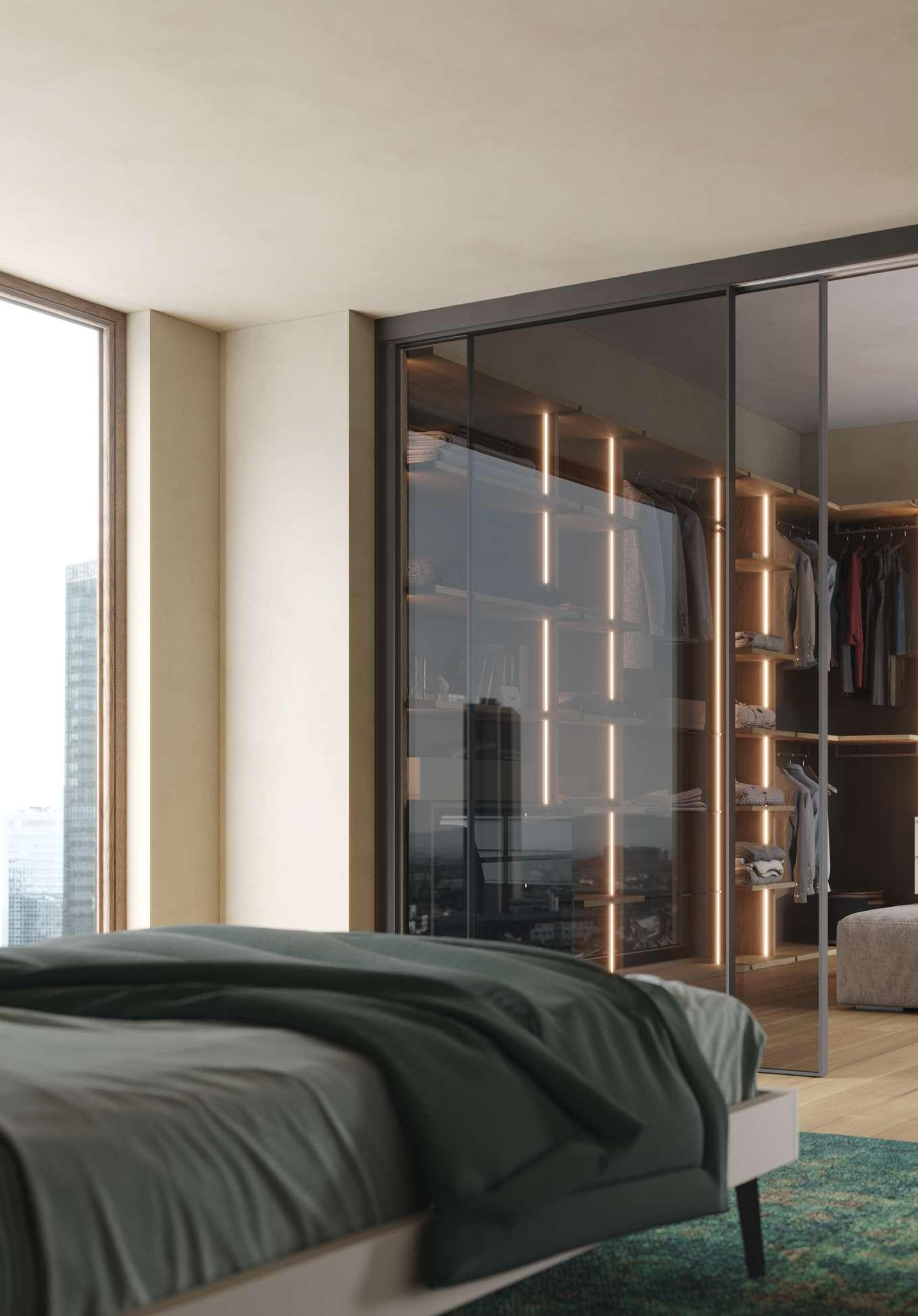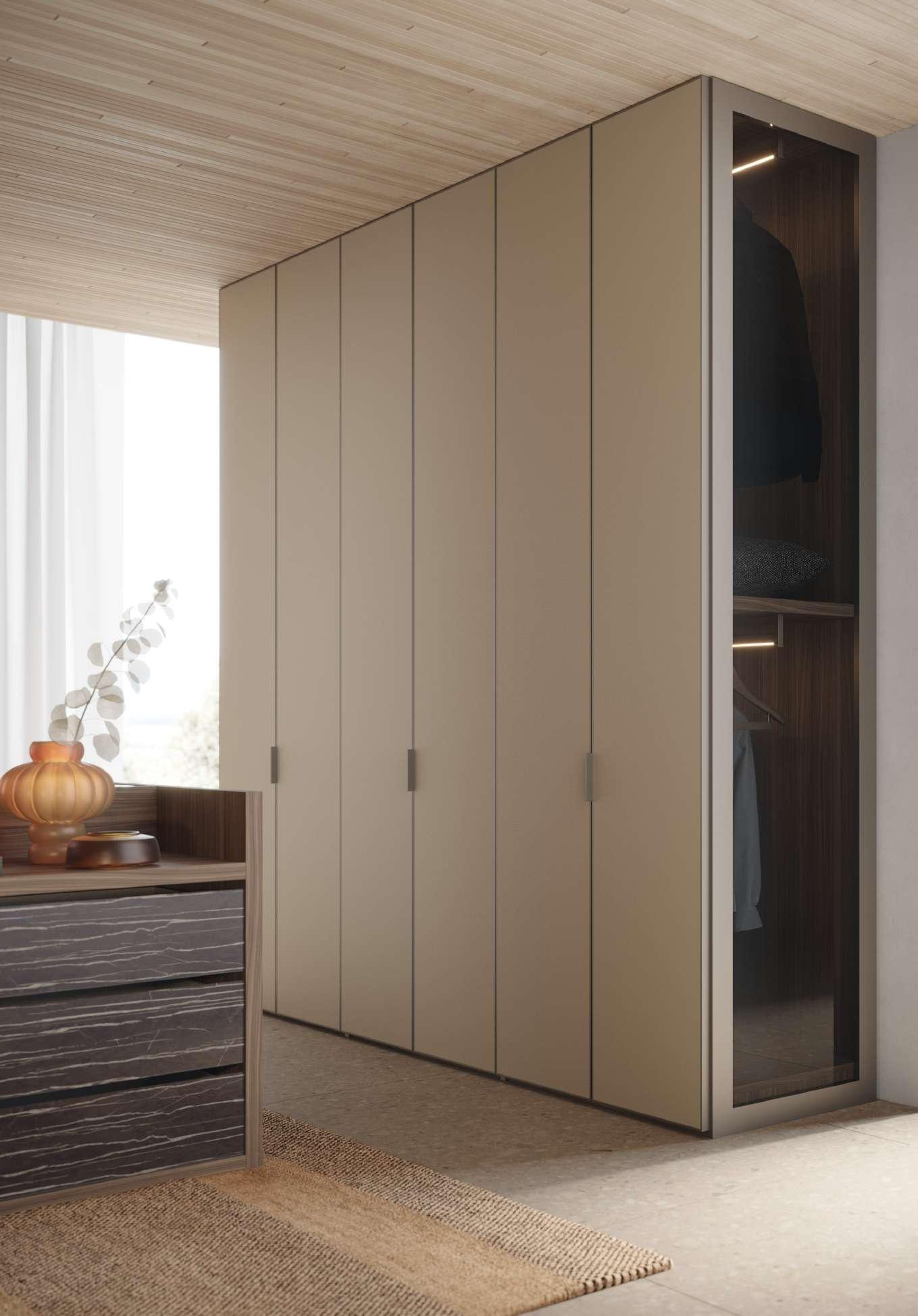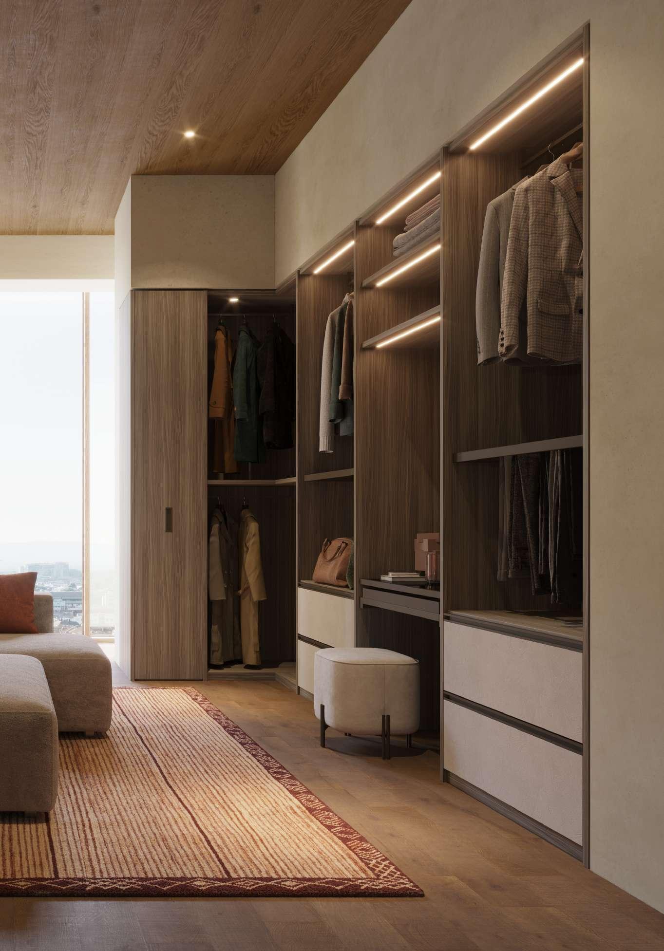 La luminosità e l'aspetto materico del Calce creano un felice contrasto con l'austerità del Noce Ossidato. Al progetto sono stati integrati, sul lato sinistro, un armadio a ponte della Collezione Night e, nel centro stanza, un divano Infinity della collezione Living.