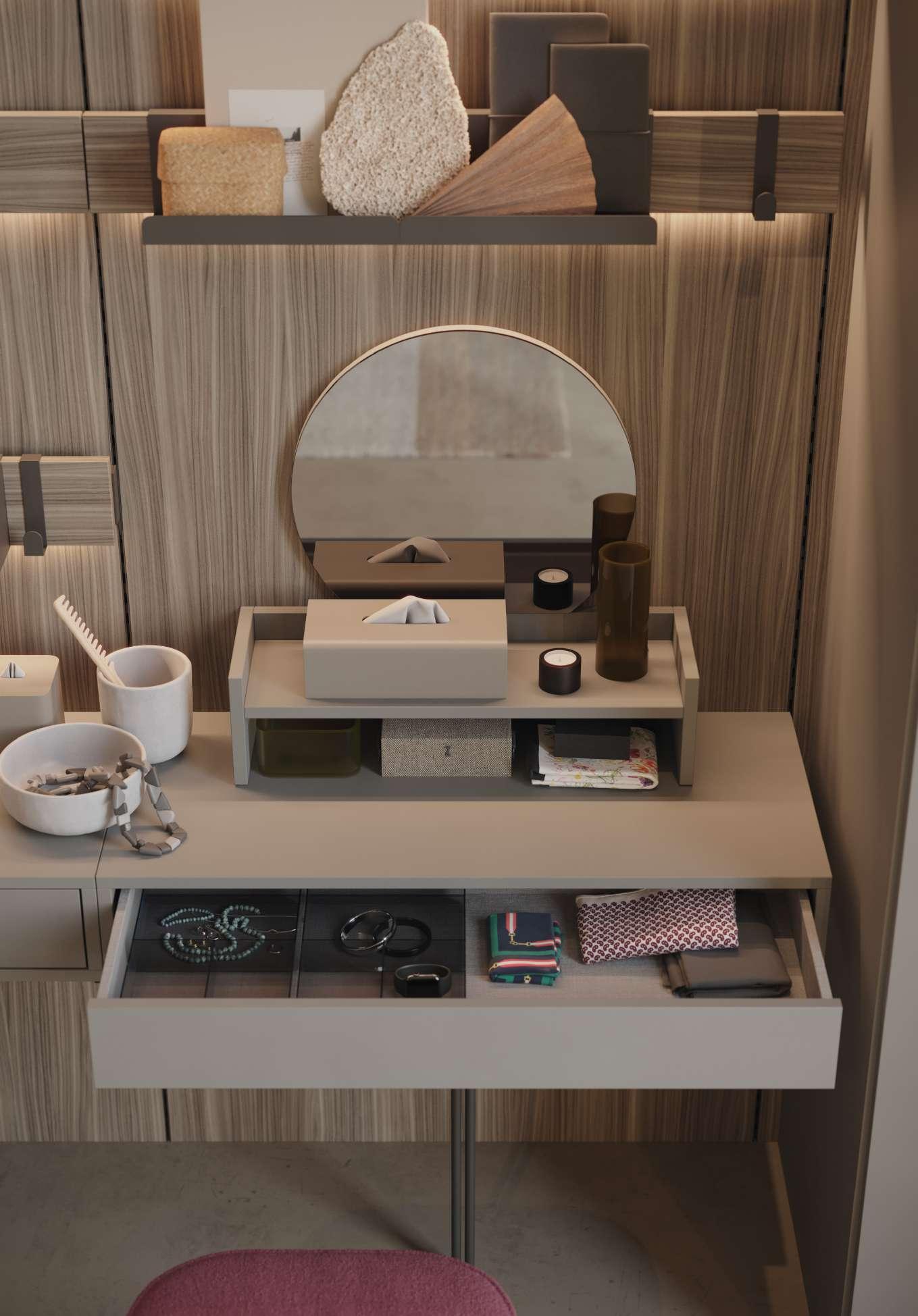 Consolle, scrivanie e cassetti vanity progettati per la routine quotidiana del make-up, le panche con i ripiani porta scarpe e le barre Led attrezzate con porta accessori in lamiera sono alcune delle novità presenti in questo catalogo.