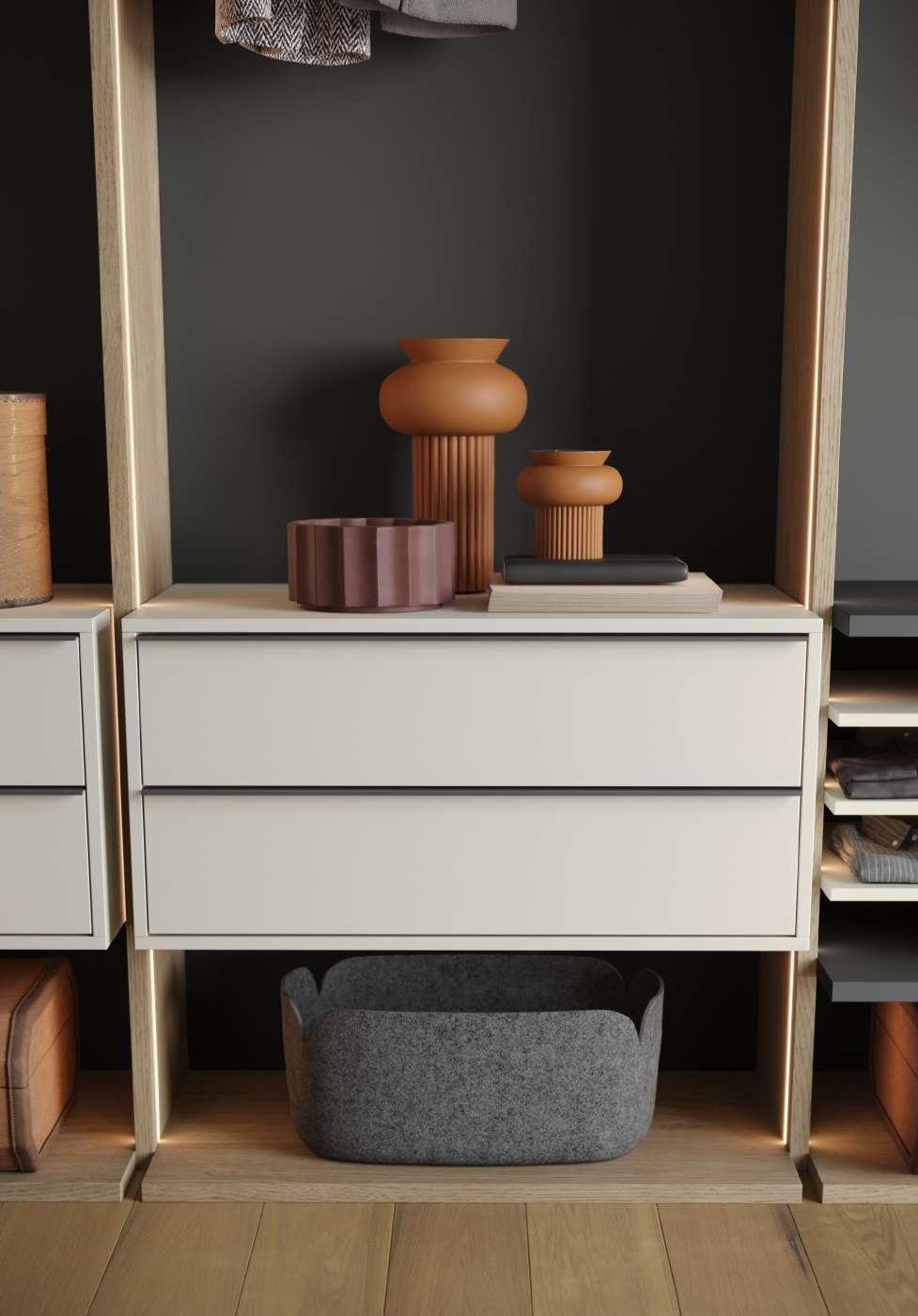 Rea è una soluzione di cabina a spalle che, con ripiani, ante e cassetti, offre un'ampia capacità contenitiva. Peltro e Seta, i nuovi laccati Fenix ultra-matt, con il loro aspetto delicato e morbido, si sposano perfettamente con la finitura Calce.