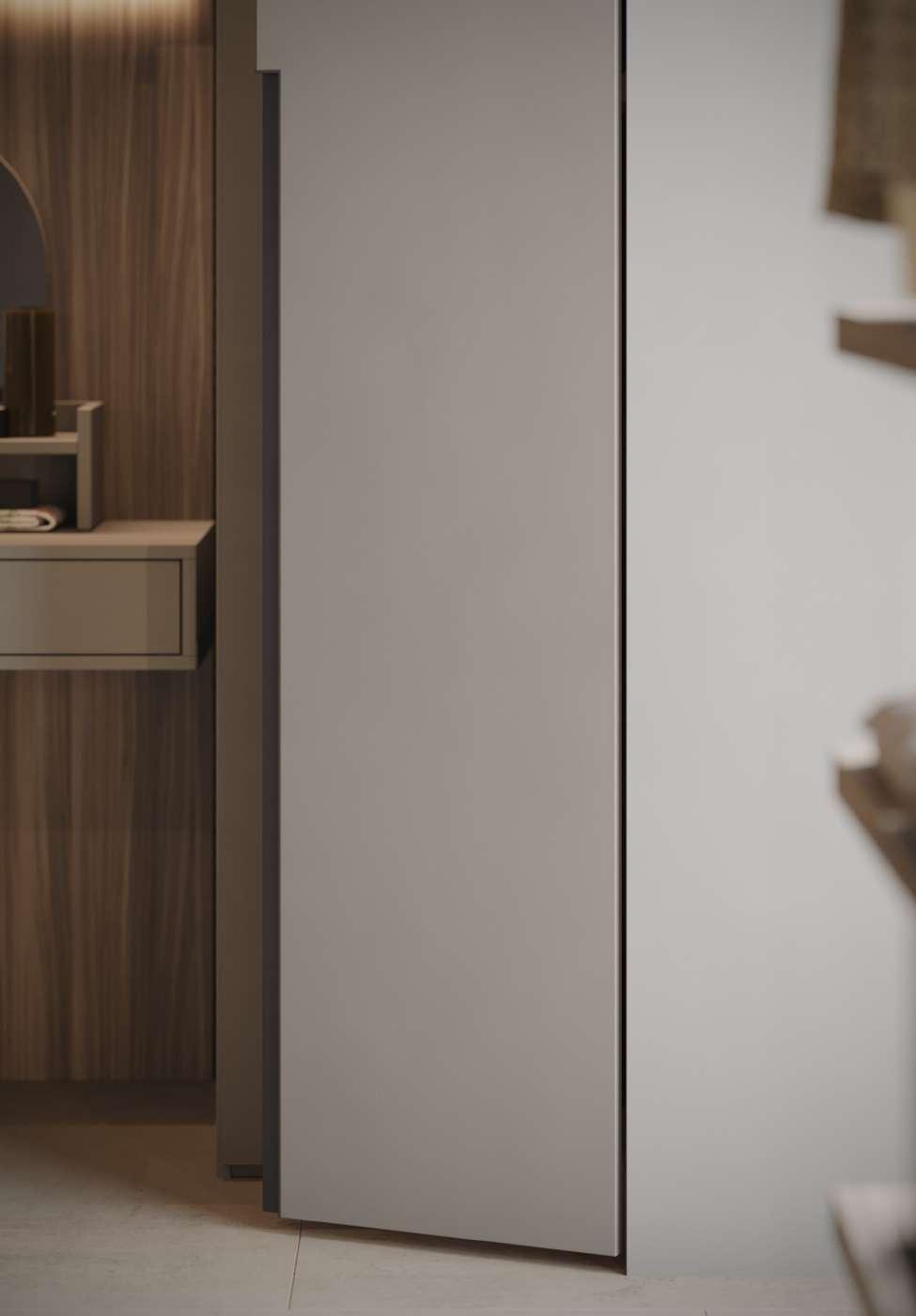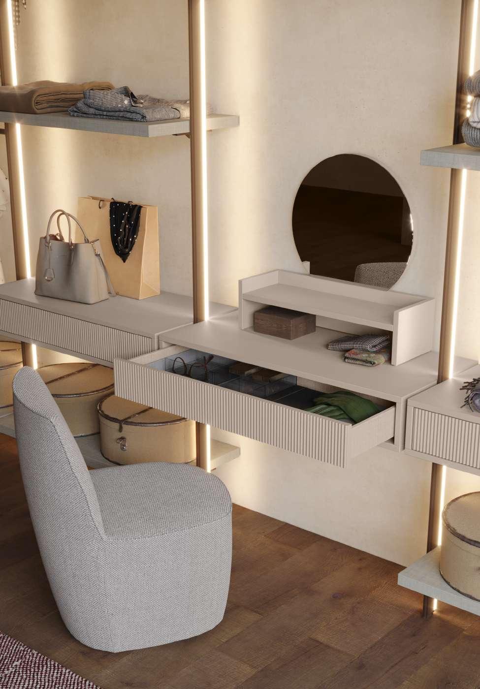 Circe, una cabina armadio dall'anima ibrida, enigmatica e seducente, è composta ai lati da due strutture con montanti e, sul fondo stanza, da due pannelli boiserie, allestiti per la zona trucco con cassetti vanity e barre Led porta accessori.