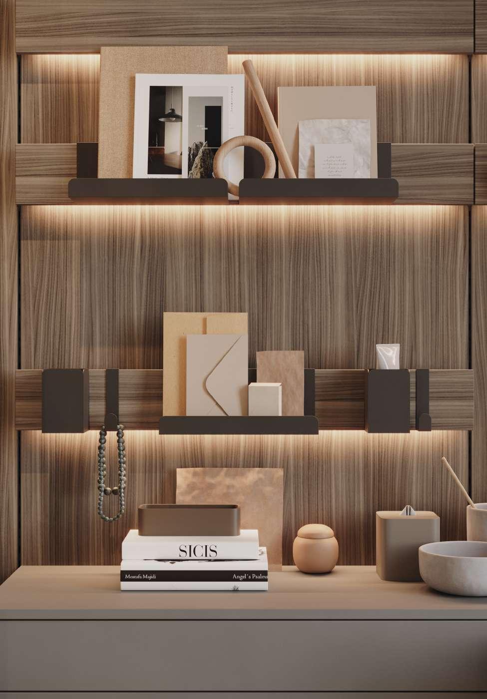 Atena, cabina boiserie qui proposta in combinazione con l'armadio Open della Collezione Night nella versione in nobilitato Noce Java e telaio in alluminio verniciato Brown. La finitura Lino delle boiserie e l'illuminazione a Led integrata nei ripiani in alto alleggeriscono le note calde e legnose del Noce Java.