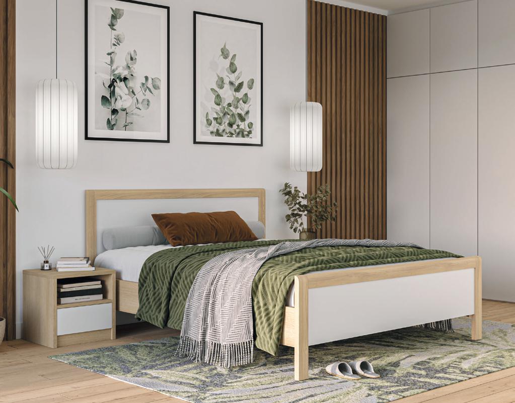 Picture shows the Layla bedside table and bed in fabric MAYA 15