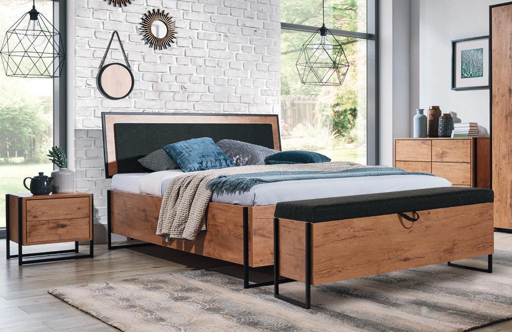 Picture shows the Bolsena bedside table and bed in fabric RANCH 12