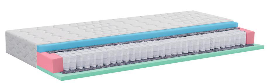 RELAX is a hybrid foam-spring mattress. Comfortable combination of properly selected highly elastic and thermoelastic foams and densely arranged pocket springs, each of which reacts separately to pressure, supports the body at multiple points and ensures a comfortable and healthy sleep also for couples of different weights. Thick, soft cover made of antibacterial Tencel fabric in blue patterns, quilted with soft high-flexible foam, guarantees sleeping comfort and highest hygiene. The entire mattress is trimmed with a gray decorative band. The underside of the cover is a breathable fabric with a fine pattern, which provides its additional ventilation. The model has vertical handles and zipper that allows to completely detach the top layer of the cover for washing.