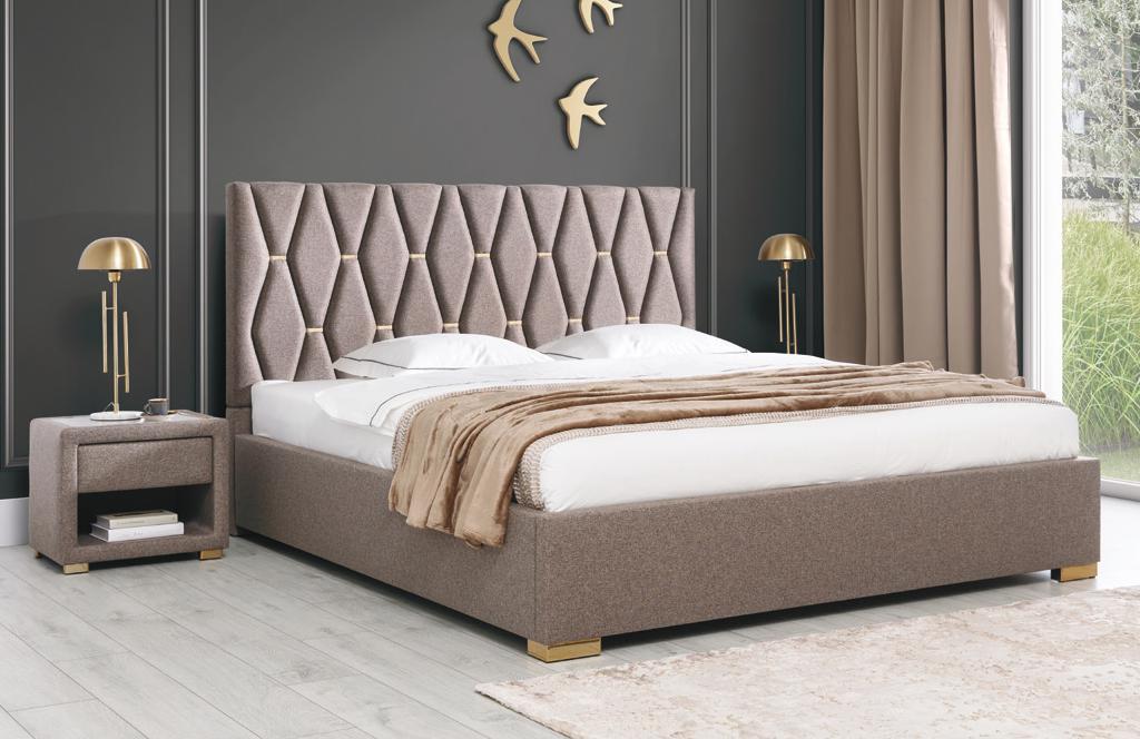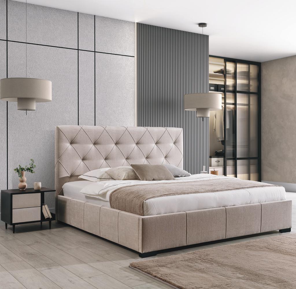 Picture shows the Prato bedside table and a bed in fabric LEGACY FOSSIL 16