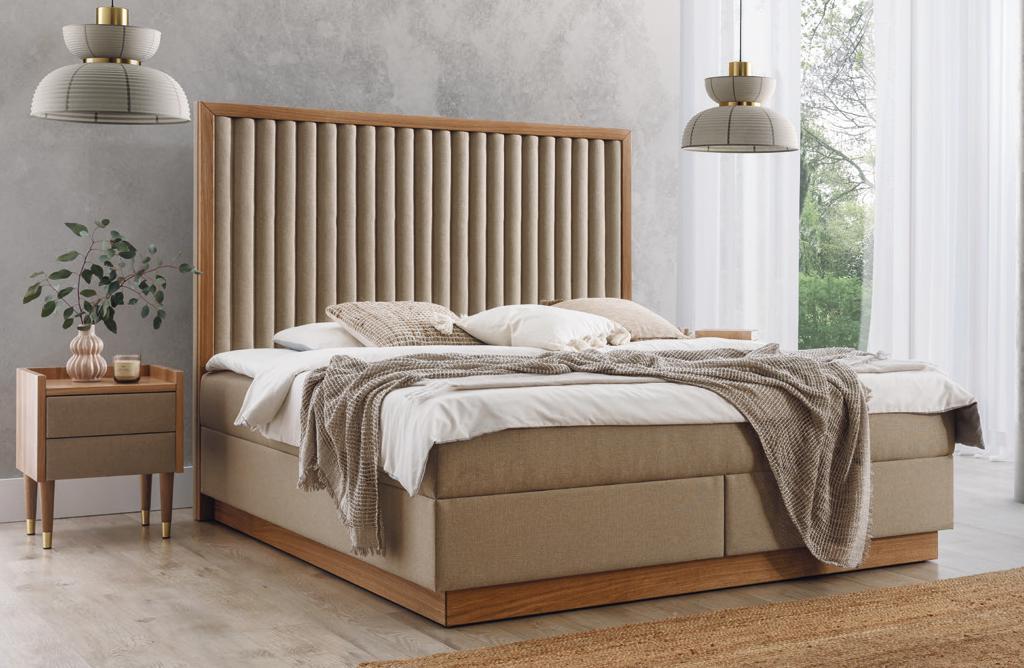 HEADBOARD 3700 Picture shows a Diamond bedside table and a bed 120 cm high, body C, stitching C, base E varnished oak, fabric MONOLITH 92
