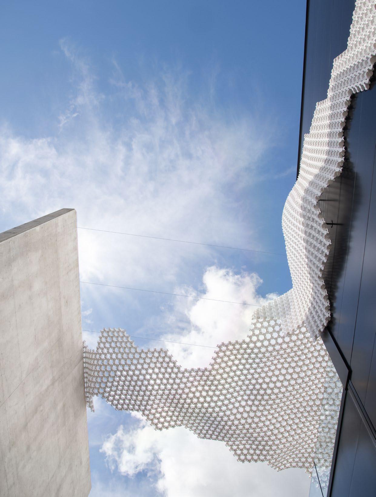 La scultura luminosa è composta da un corpo illuminante modulare che crea onde sinusoidali nello spazio, avvolta da layer in policarbonato tutti diversi fra loro.