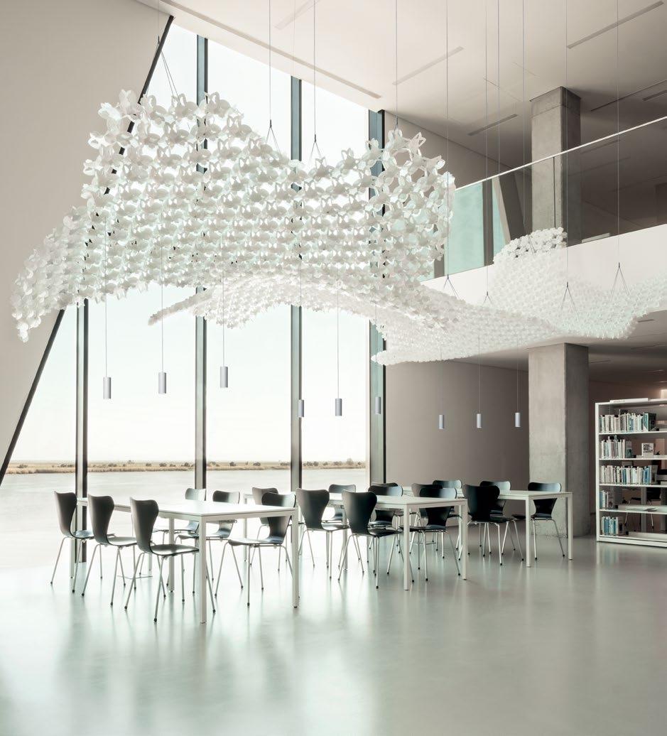 The illuminated modular system sinuously undulates throughout a space with diverse polycarbonate layers that in the lamp’s highest points, reach two meters of visionary fluidity.