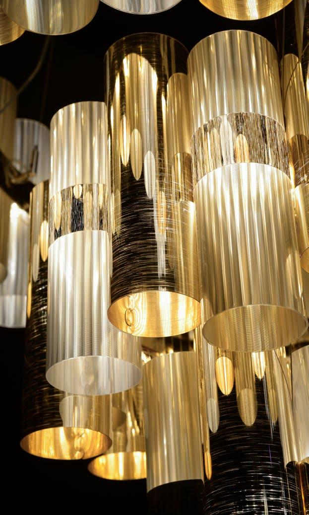 Gold has Cristalflex® arms metallized in a hyperbaric chamber; each piece is cut numerically, wrapped, and placed within the shipping box. Clients can rapidly and intuitively assemble the lamp.