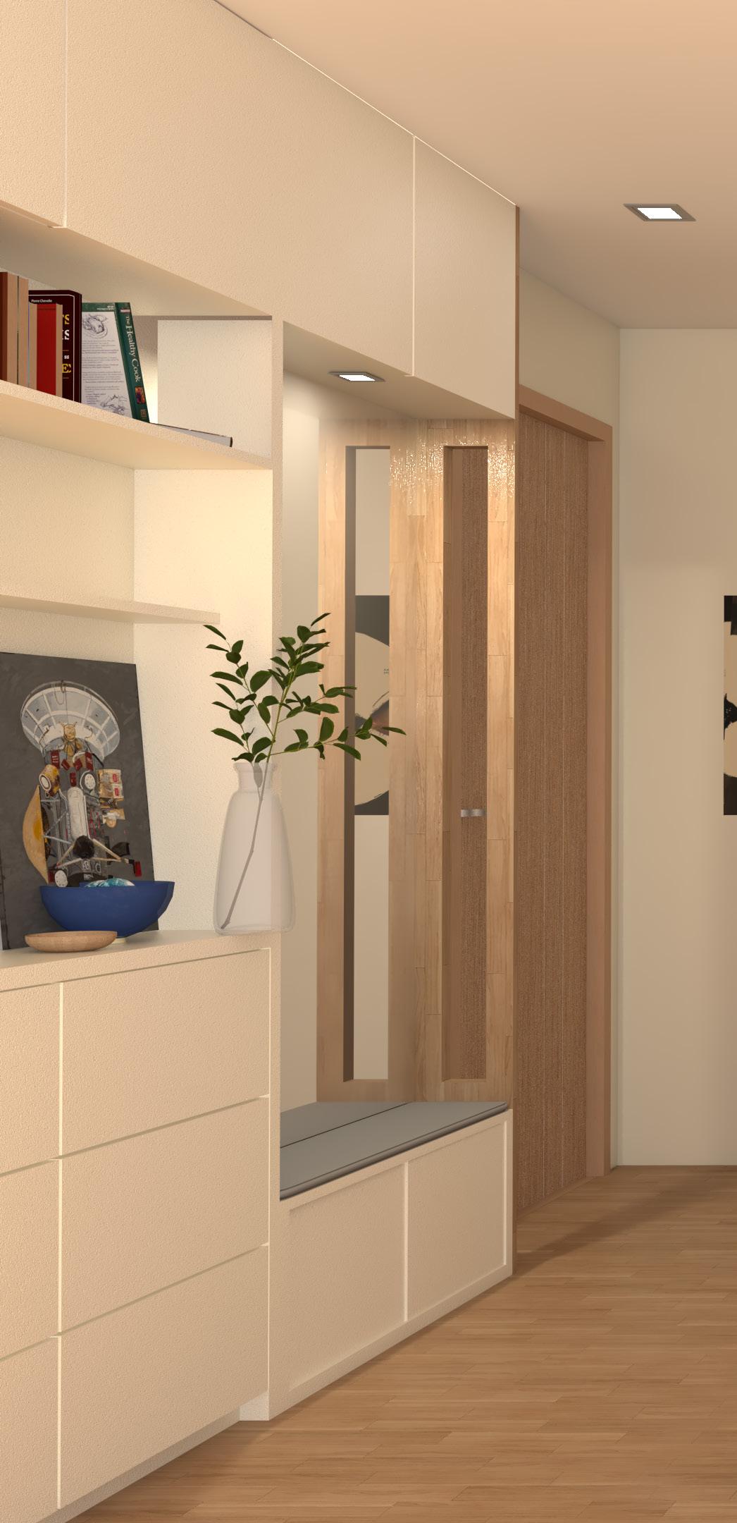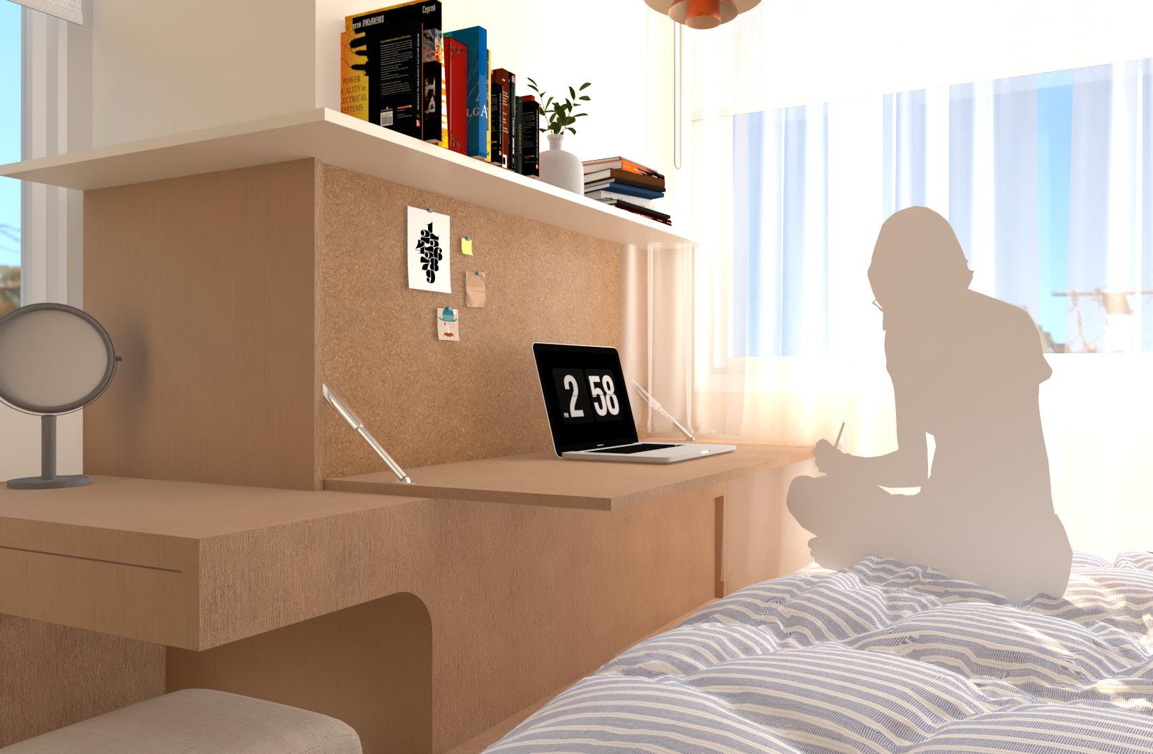 In the bedroom, a few wall-mounted foldable desks were installed since the wife loves to move around the house when working.