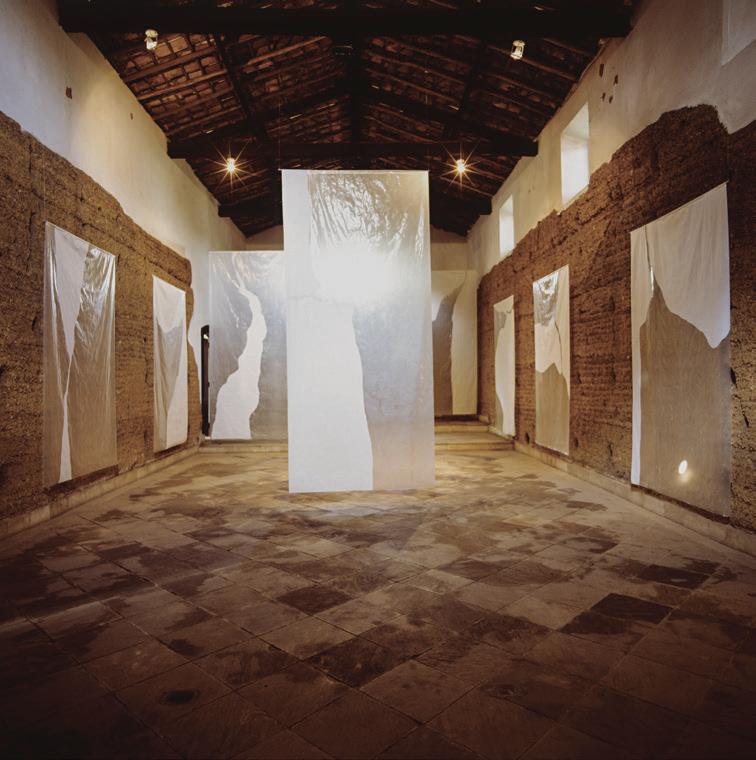 But contrary to what one might believe, Germana‘s painting does not derive from images and photographs. She did it the other way around. First came engraving, drawing and painting, always marked by the search for the infinite, organic line on the surface of the paper. Then came the photographic records of natural lands capes. Since the year 2000, Germana has been developing paintin gs that gained three-dimensional space as they “detached” from the wall. In her installation at the Capela do Morumbi (Morumbi Chapel) in São Paulo in 2000, the paintings made with transparent damar vanish on paper were affixed with some distance from the