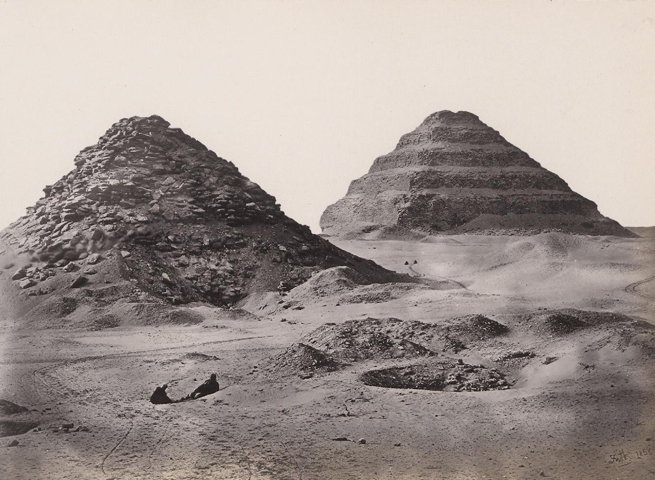 2 salted paper prints with rounded corners, mounted to trimmed board. 15,6 x 21,2 cm and 16,7 x 21,2 cm. One print dated “1853” in pencil in lower right corner of mount.
