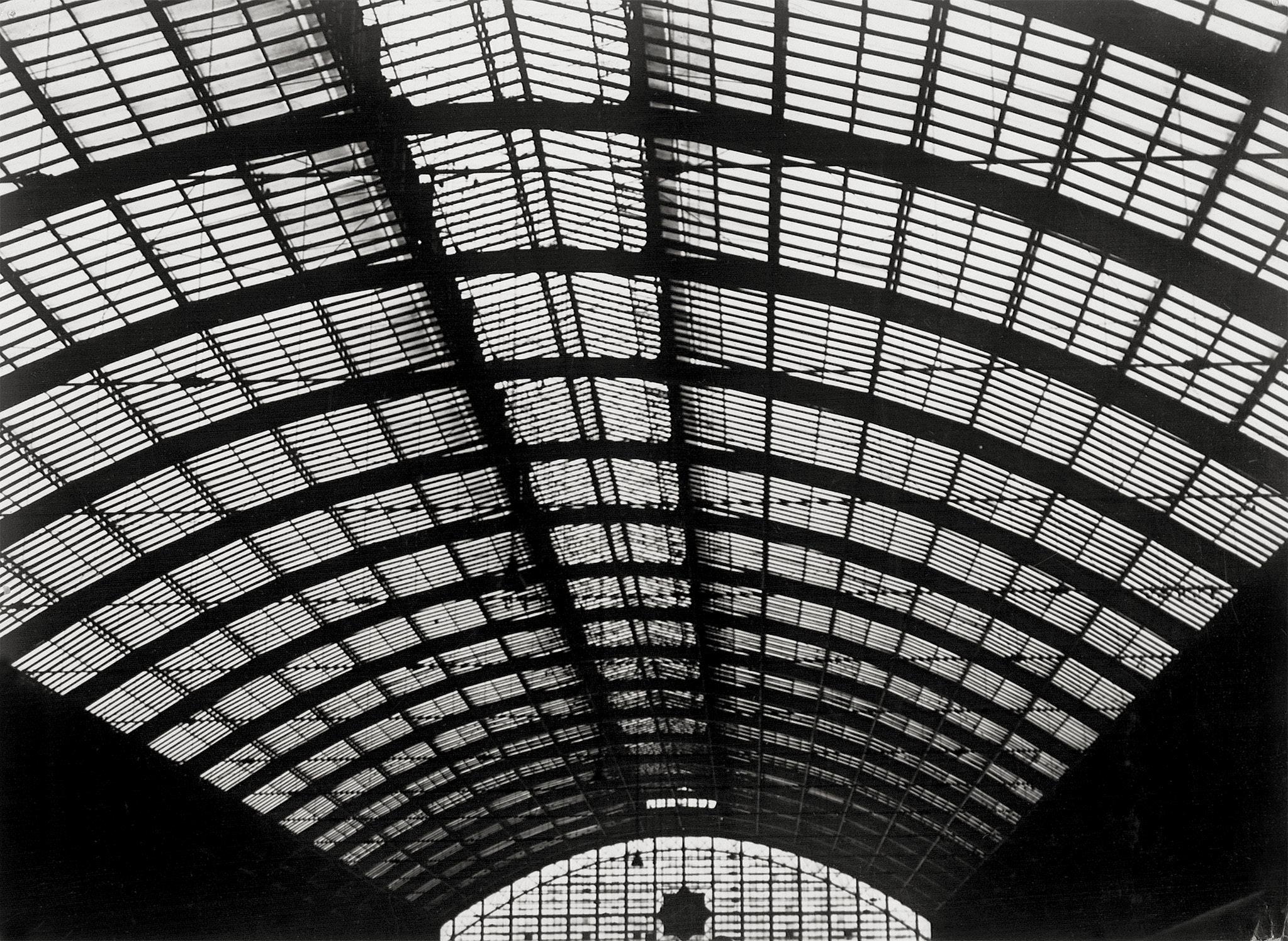 4229 Berlin train station. Circa 1927. Vintage ferrotyped gelatin silver print. 17,5 x 23,5 cm. Photographers‘s copyright stamps (Berlin and Brussels) as well as numbered and annotated in pencil and red ink on the verso, hinge-mounted in upper edge in mat.