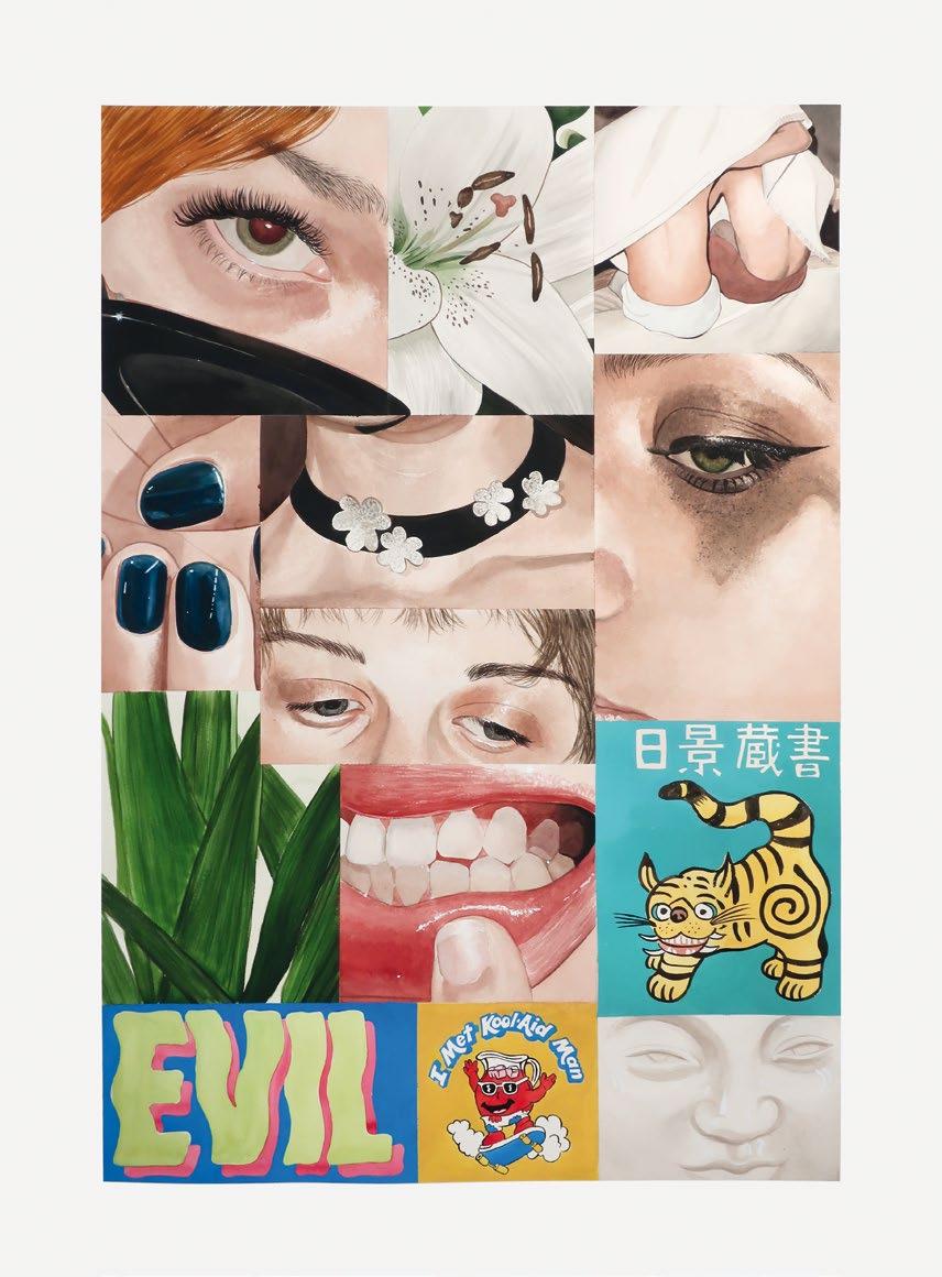 Dans ces traductions personnelles, chacun donne à voir sa vision ambivalente et morcelée du monde. Le réalisme de Shu Rui, qui prend ses racines dans son éducation chinoise, porte un regard critique sur la société de consommation, tout comme il interroge l’impact de la guerre et celui des médias dans nos vies quotidiennes, noyées entre privation et abondance, fiction et réalité. Par ses montages audacieux et son usage de la couleur, entre séduction et « expressivité désincarnée », le travail d’Armand Jalut soulève la question du corps-objet et du vide déshumanisant à l’œuvre dans nos sociétés du paraître. Les morceaux de bouche, d’yeux, de nourritures, de logos, de plantes, peints à l’aquarelle par Léo Dorfner sont comme des « petits poèmes visuels ou des films » : ils captent « le flux de la jeunesse d’aujourd’hui, rythmée par le flux incessant d’images débordant des réseaux sociaux », dans ce qu’elle a de beau et d’angoissant.
