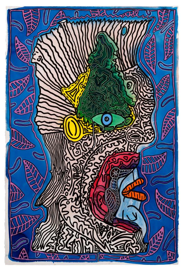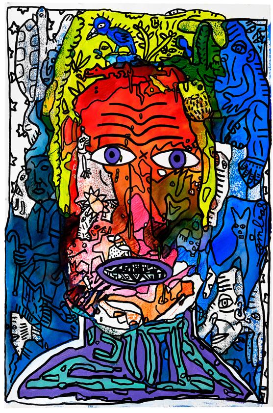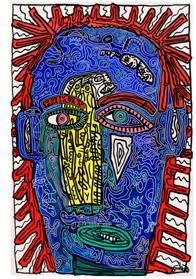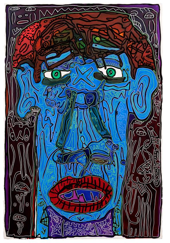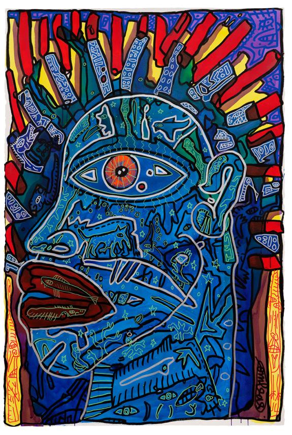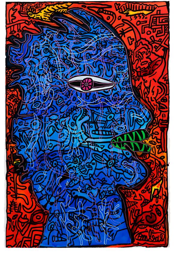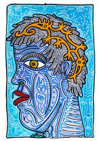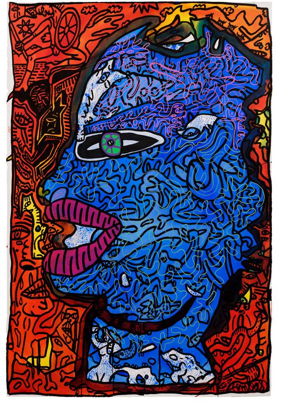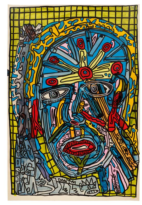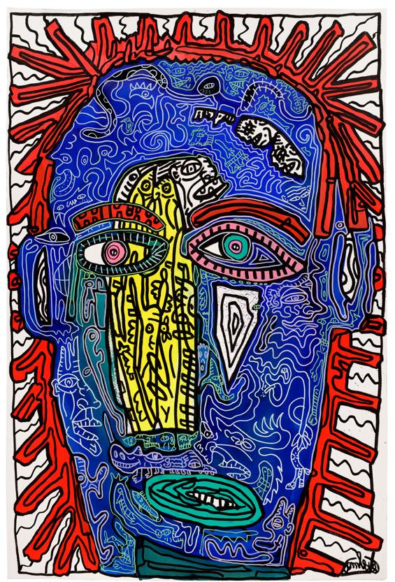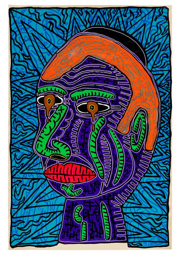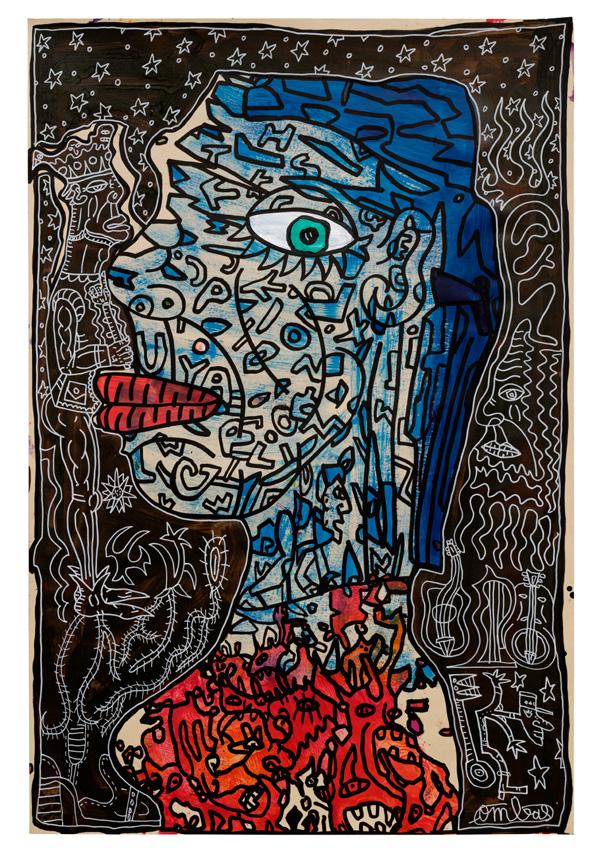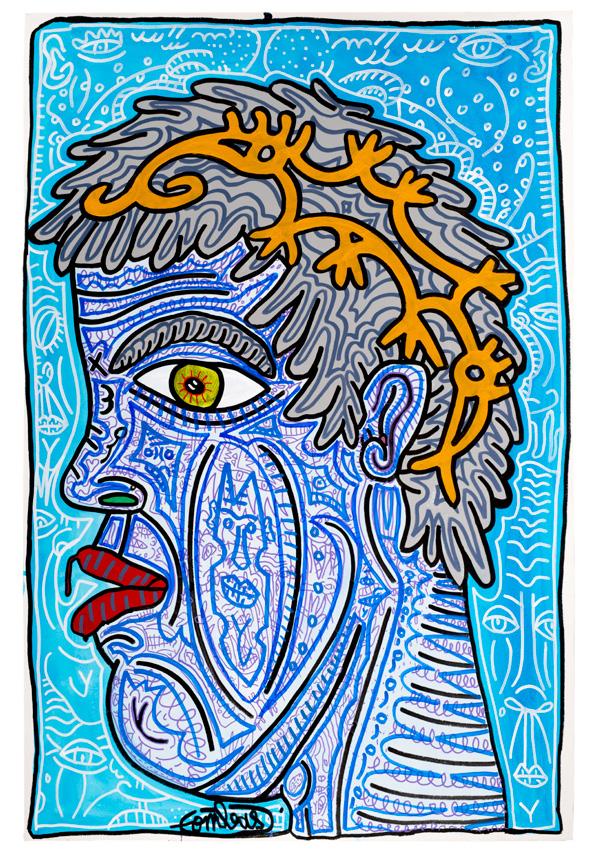 Grosse tête bleue pleine de ressenti d’un barbu aux yeux bridés. Bidules et dessins abstraits.