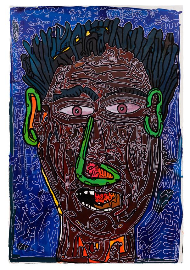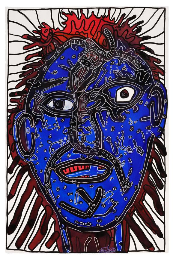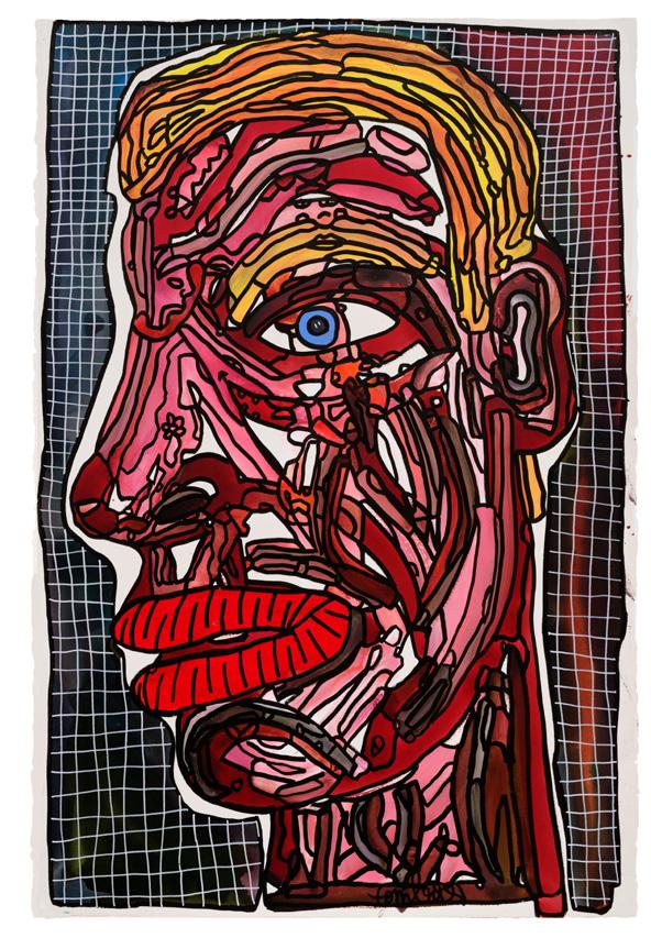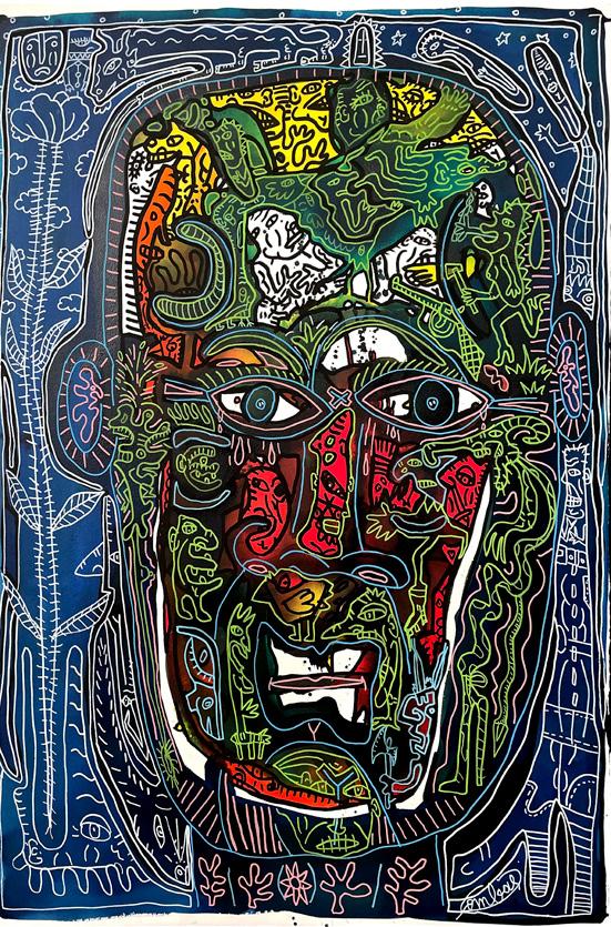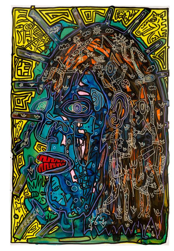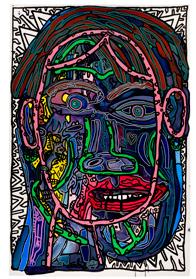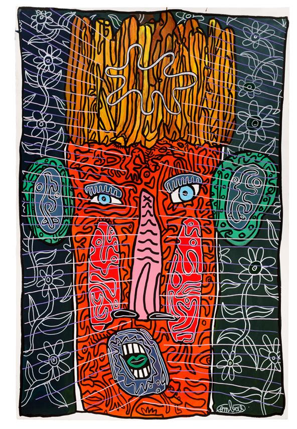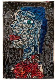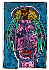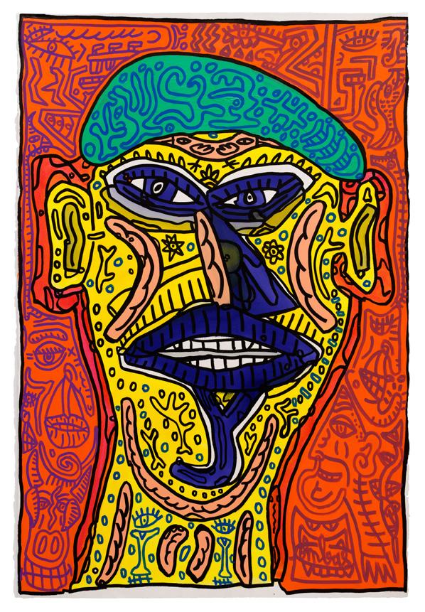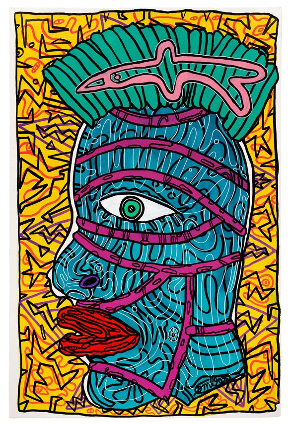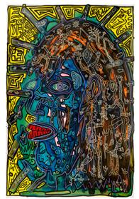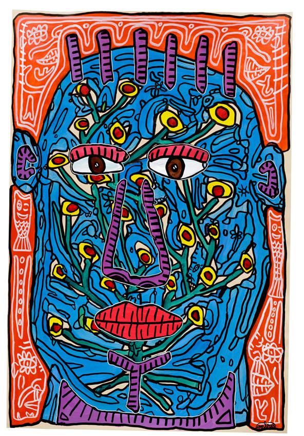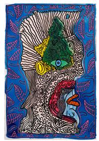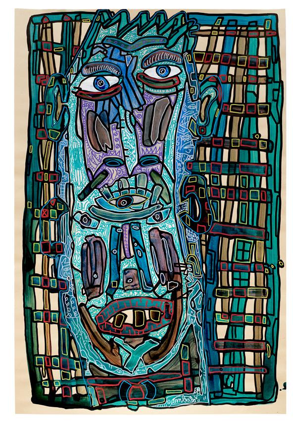 Grosse tête bleue pleine de ressenti d’un barbu aux yeux bridés. Bidules et dessins abstraits.