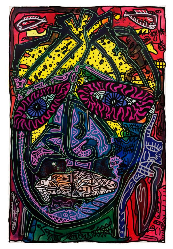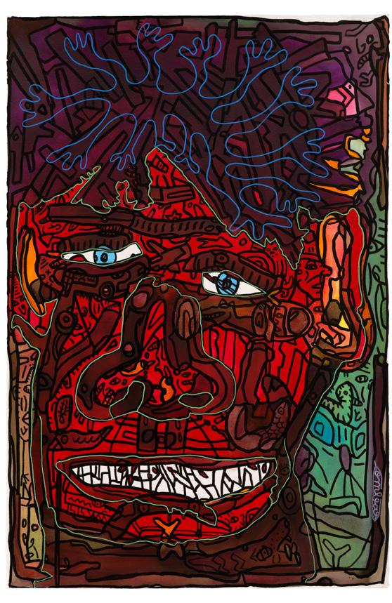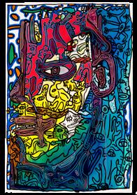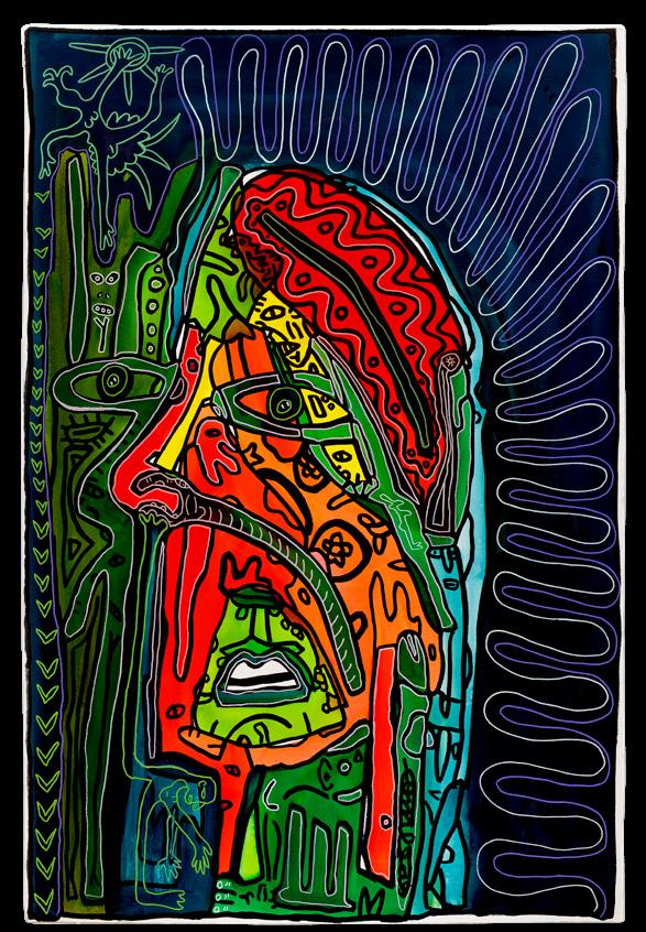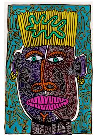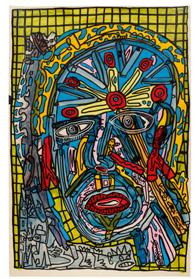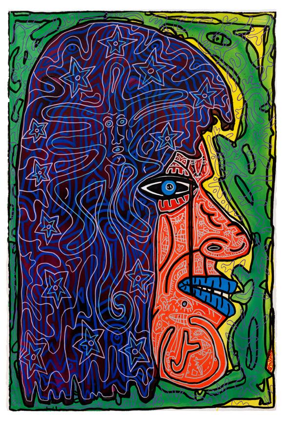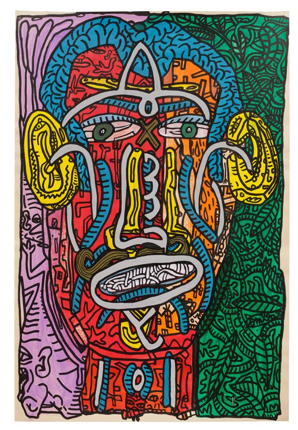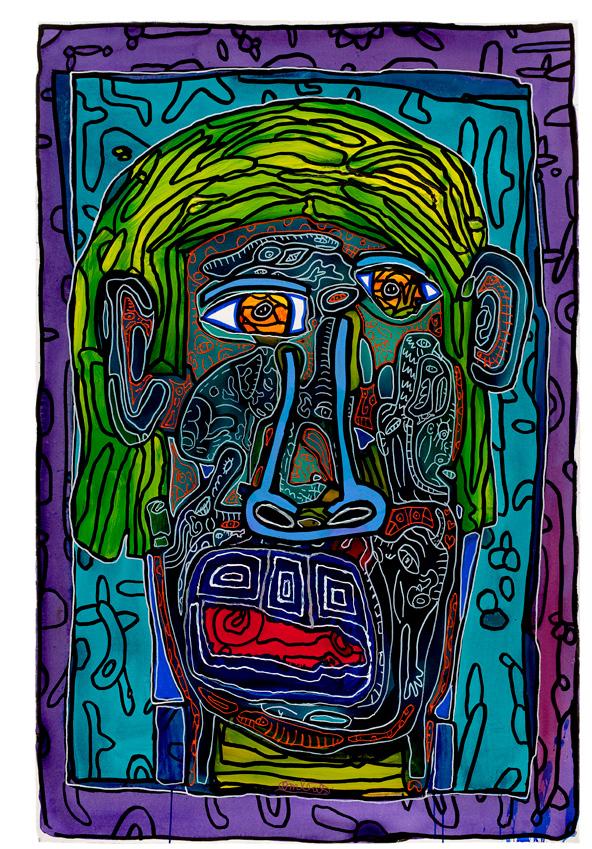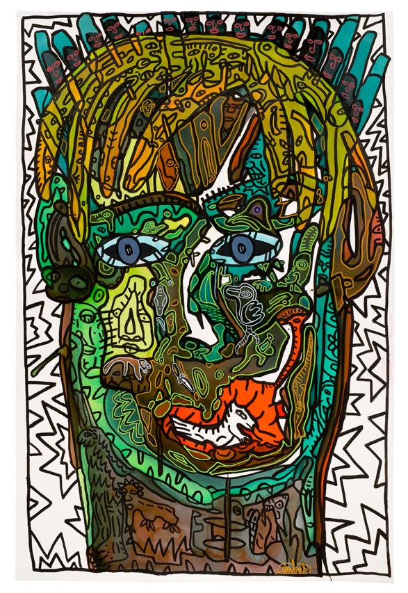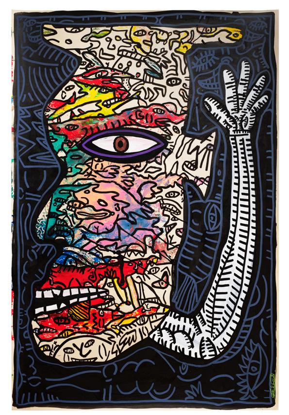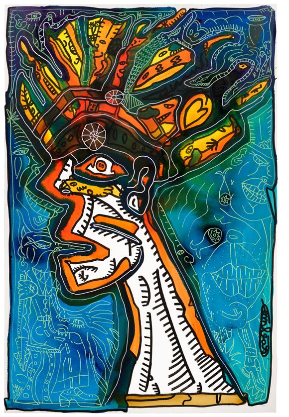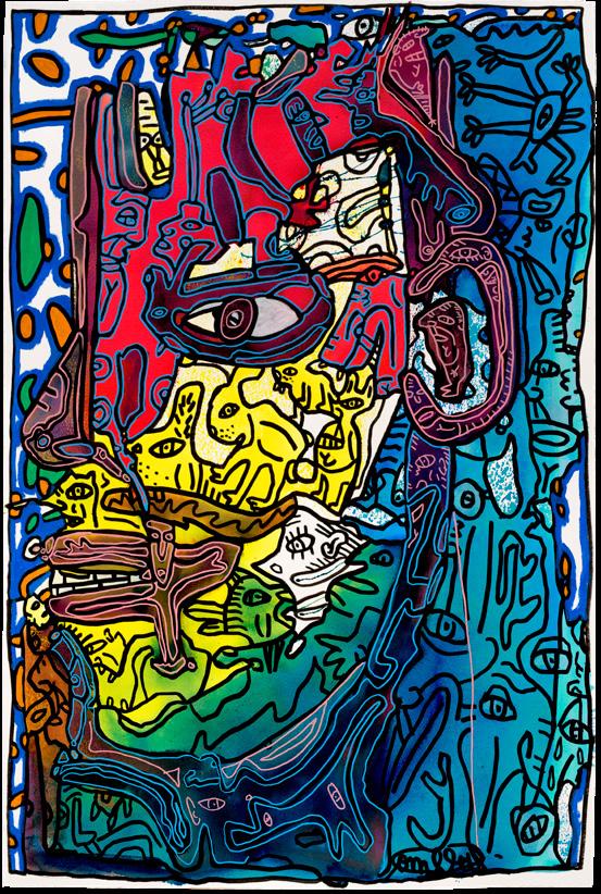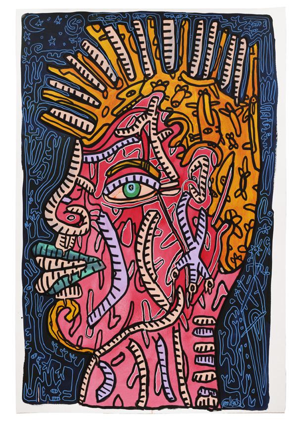 Grosse tête bleue pleine de ressenti d’un barbu aux yeux bridés. Bidules et dessins abstraits.