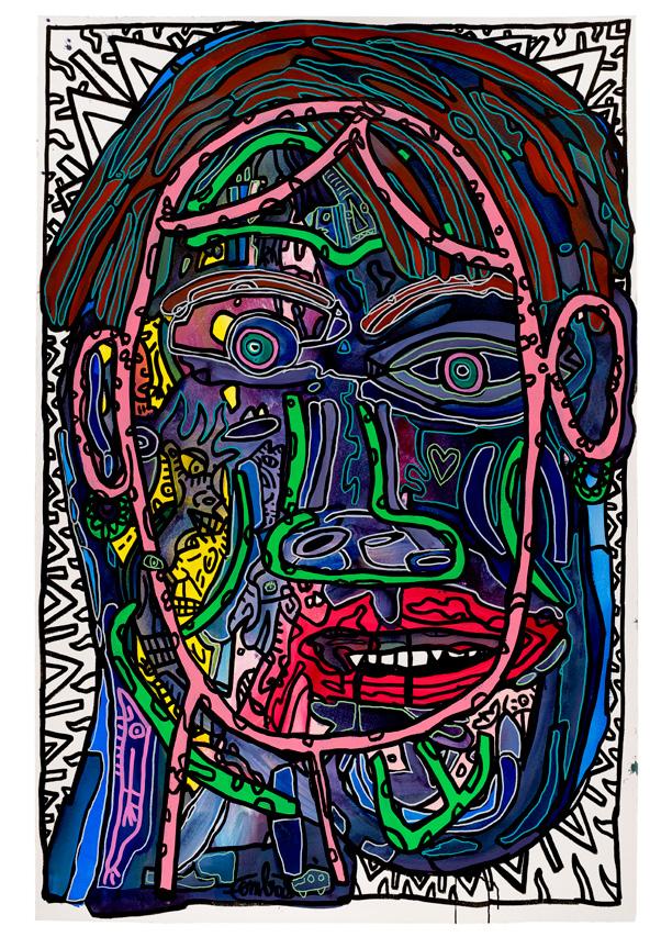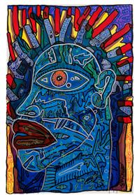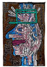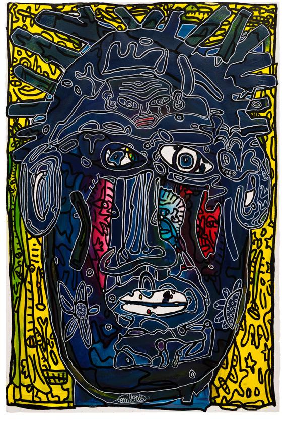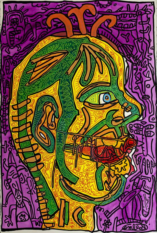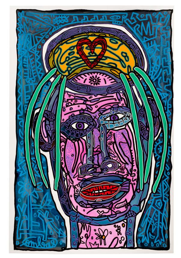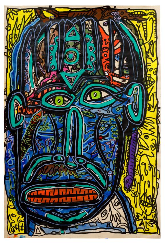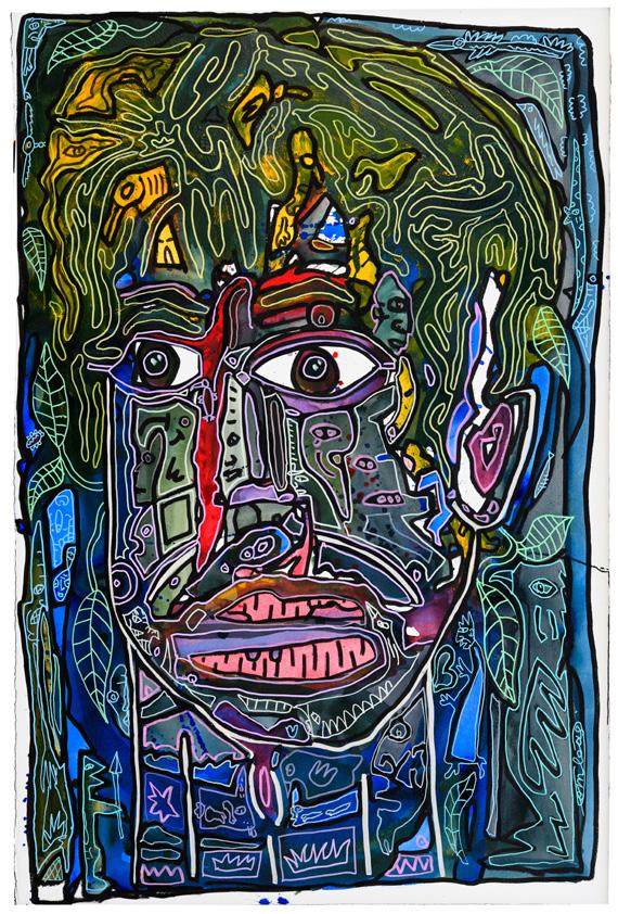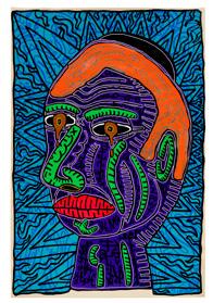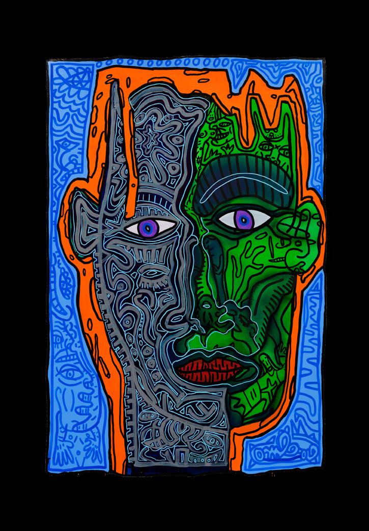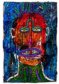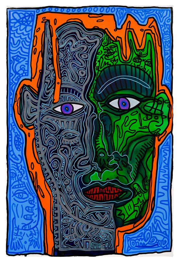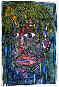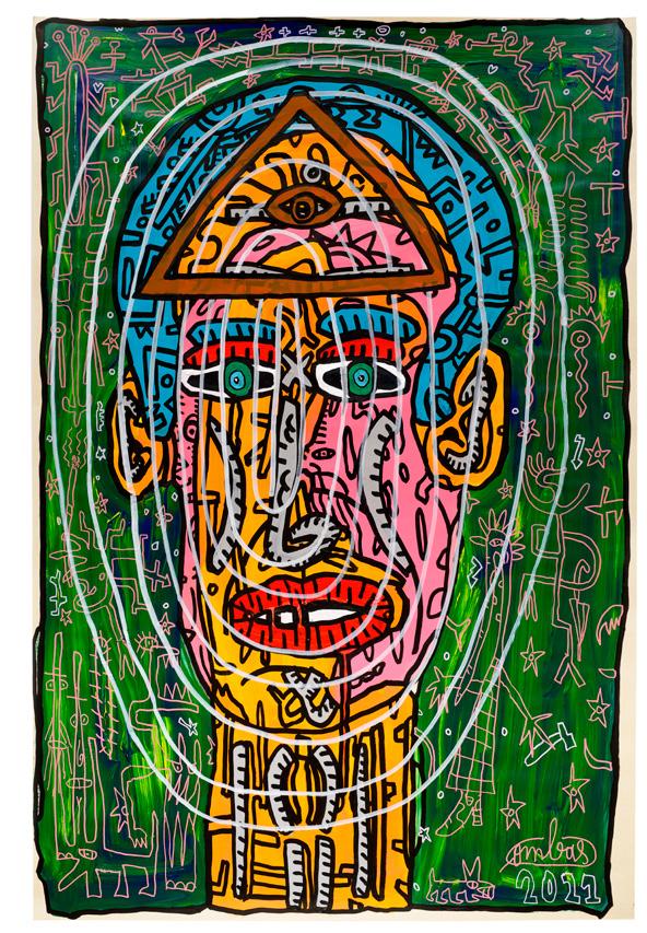 Grosse tête bleue pleine de ressenti d’un barbu aux yeux bridés. Bidules et dessins abstraits.