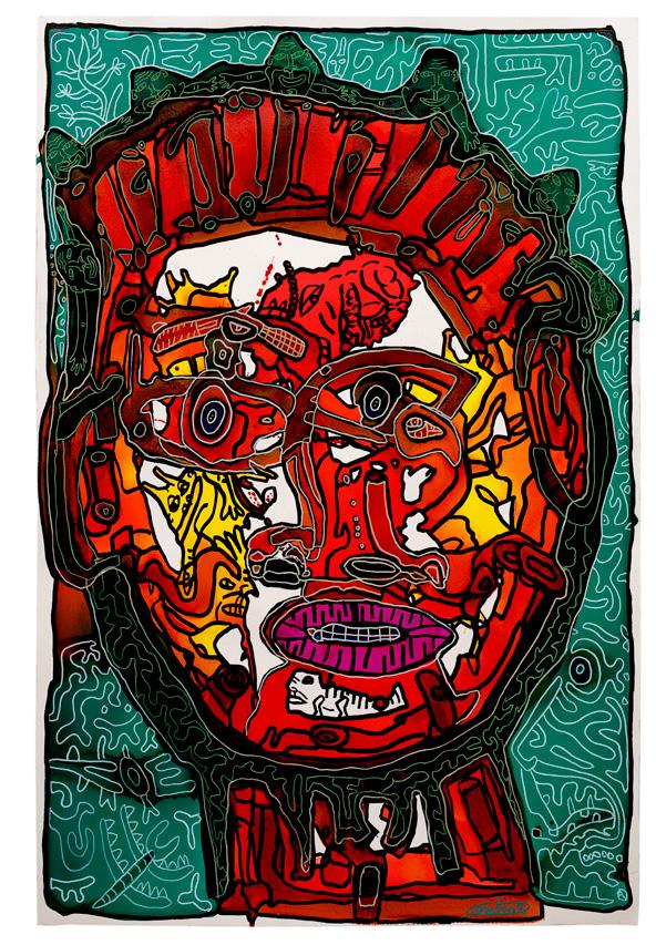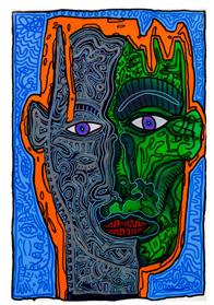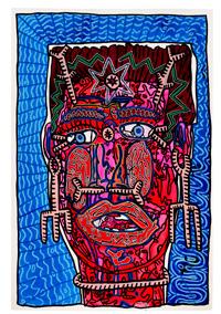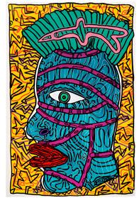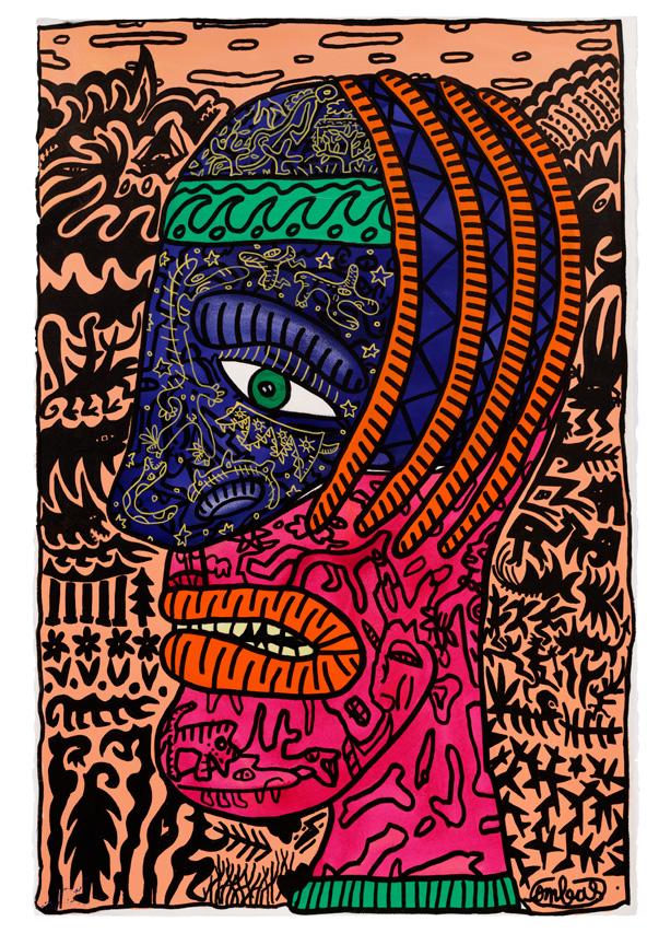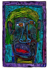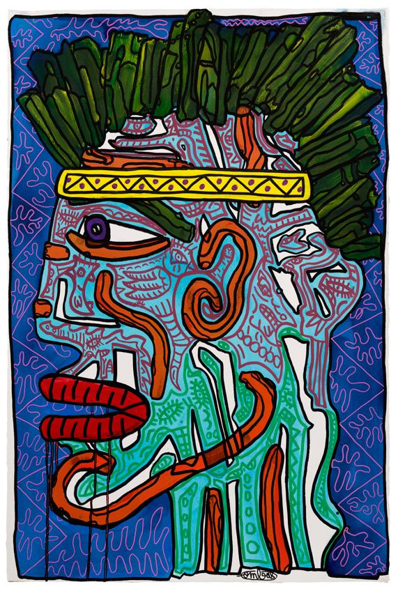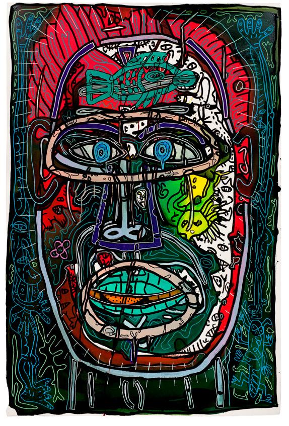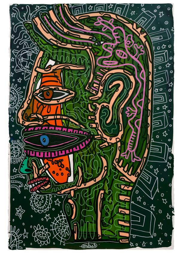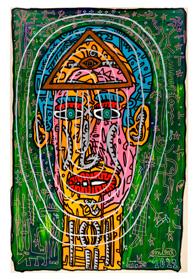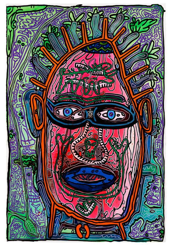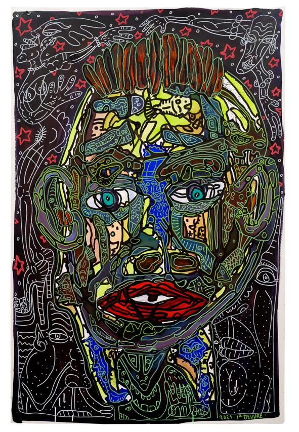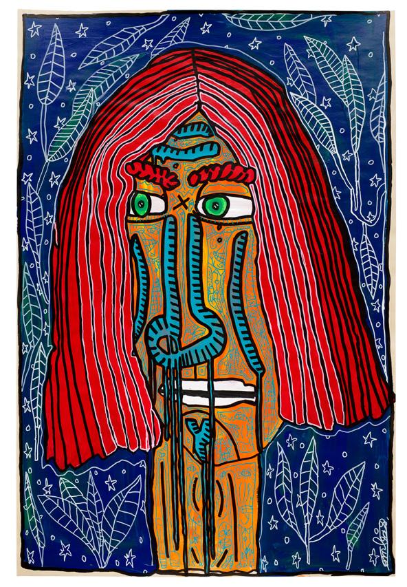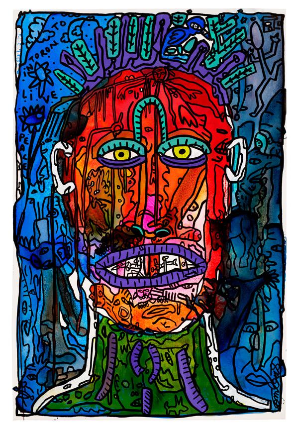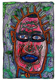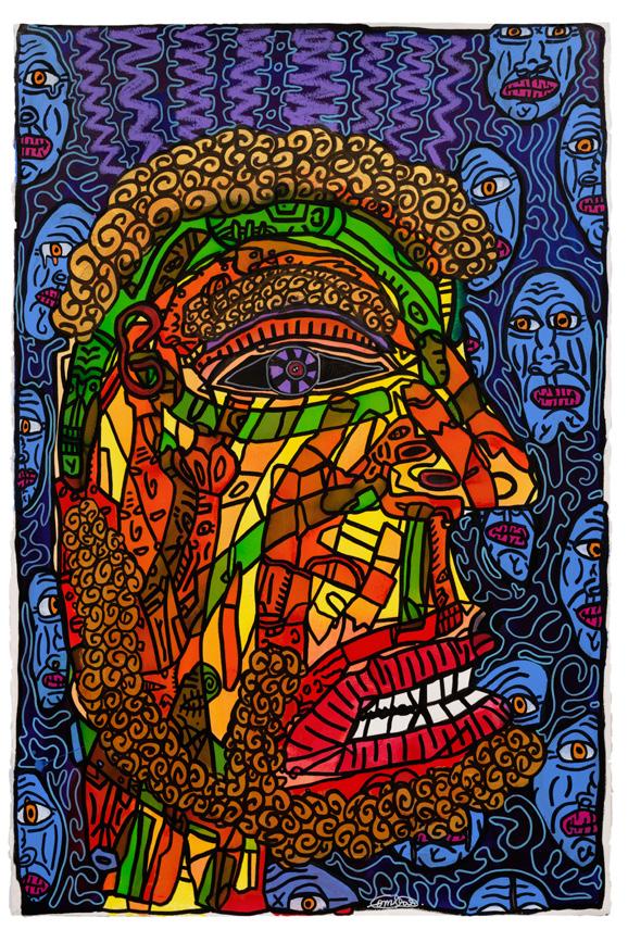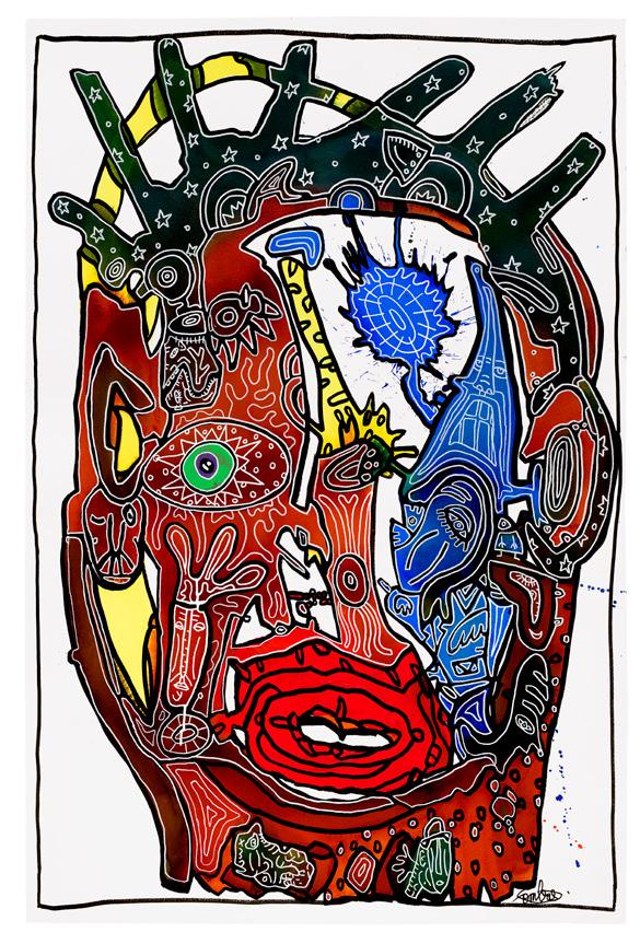 Grosse tête bleue pleine de ressenti d’un barbu aux yeux bridés. Bidules et dessins abstraits.