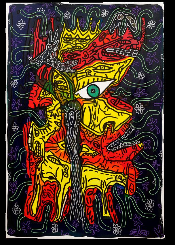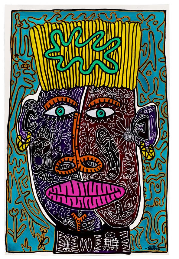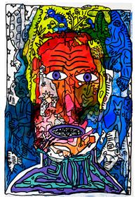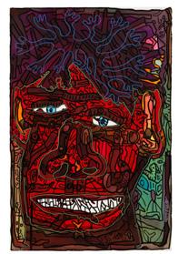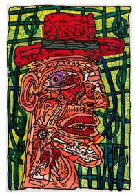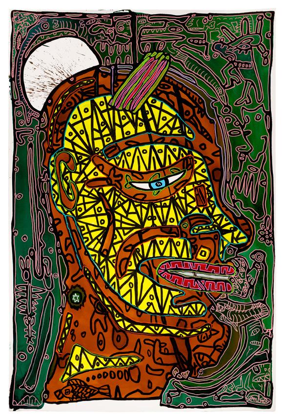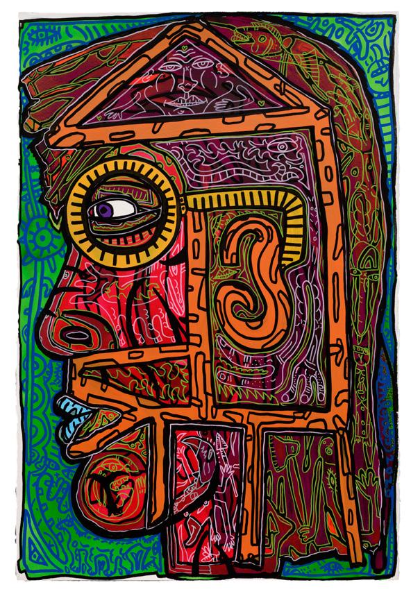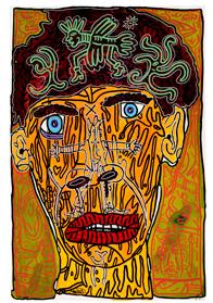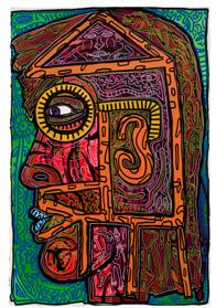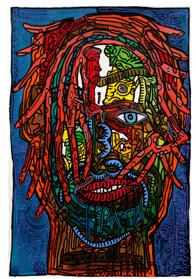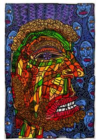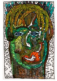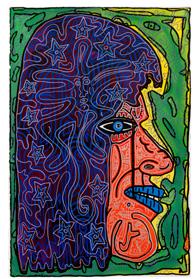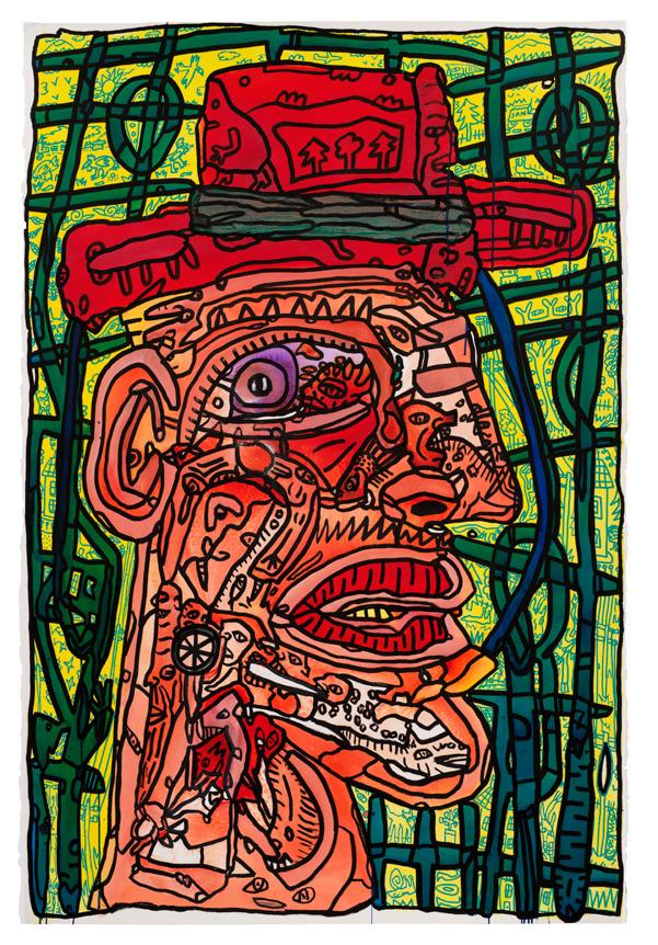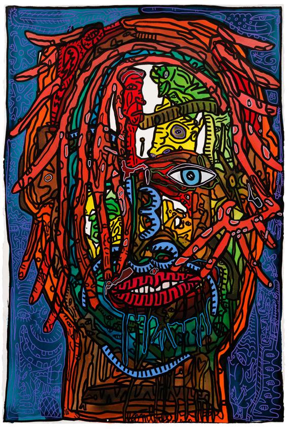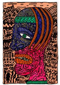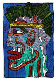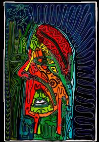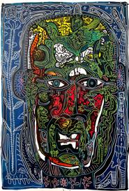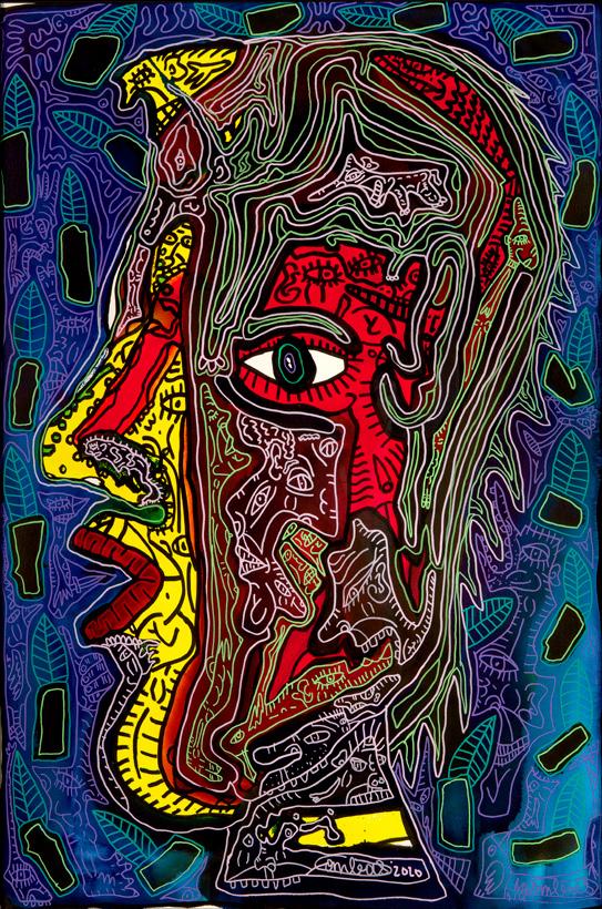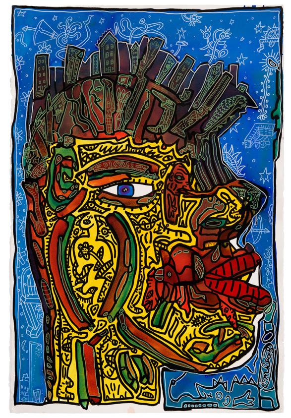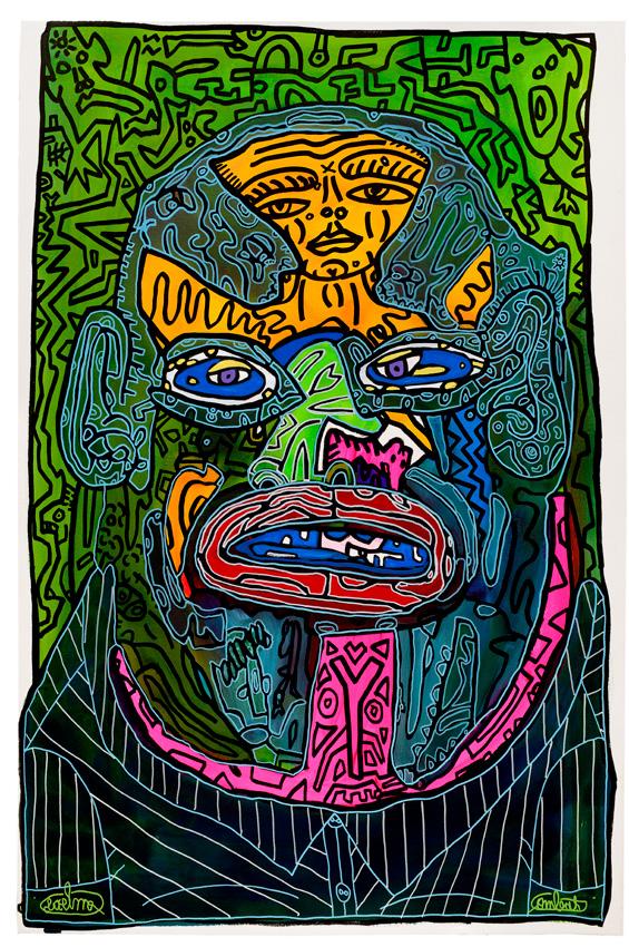 Grosse tête bleue pleine de ressenti d’un barbu aux yeux bridés. Bidules et dessins abstraits.