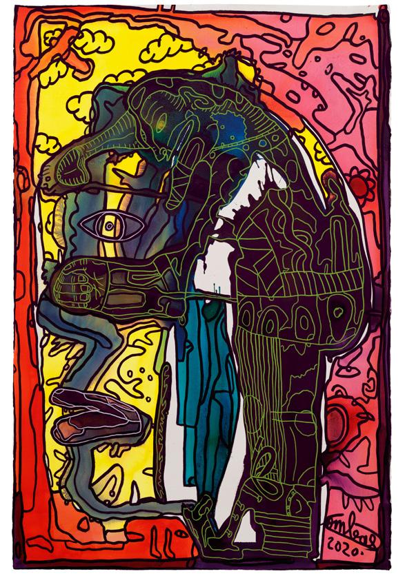 Confiné dans sa maison et dans sa tête, ne croisant personne, Robert Combas peint passionnément, à la rencontre des autres dans ces portraits à l’encre vive. Comme s’il représentait tous ces gens qu’il avait seulement croisés en sortant de chez lui et que, pour la plupart, il ne reverrait sans doute jamais, la terre étant trop grande sous ses pieds, et les hommes trop petits dans l’infini pour qu’ils puissent tous rester à la portée de ses yeux.