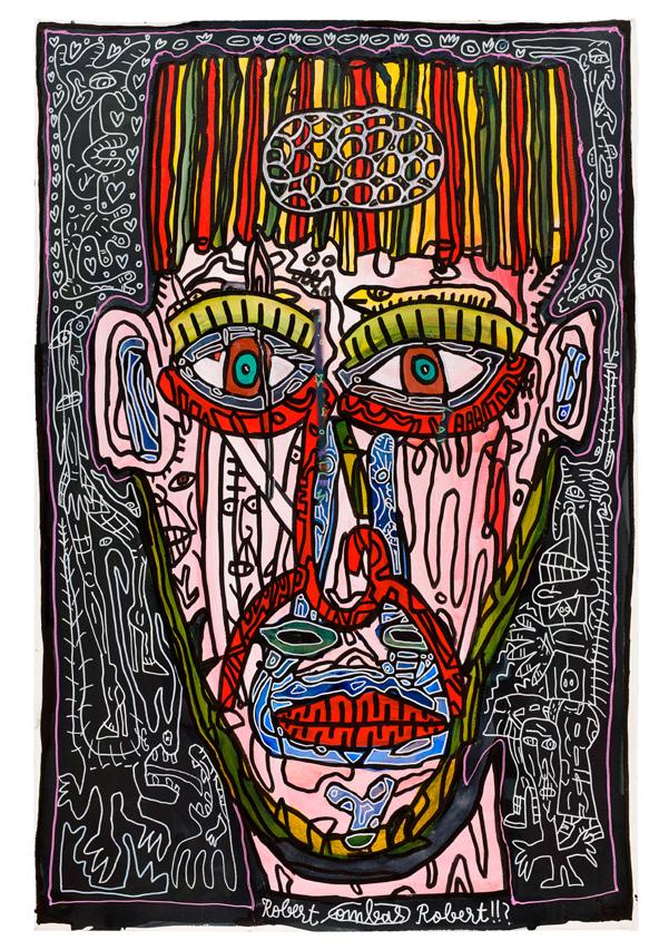 Pour lui-même, Robert Combas est en apparition et en disparition permanentes devant lui, comme s’il passait sans cesse devant lui et qu’il portait cet instant de vie et de mort en lui, cet instant de nuit et de jour, le temps qui passe. Robert porte en ses portraits le temps qui passe. Il porte la Terre qui tourne sous ses pieds et autour du Soleil. Ses portraits sont un seul portrait qu’il repeint chaque jour, un seul portrait que le mouvement de la Terre qui avance tout autour de la lumière et de l’obscurité repeint à chaque tour. Comme si la lumière et l’obscurité repassaient sans cesse devant son pinceau que le mouvement de la Terre faisait tourner et avancer sur la toile entre ses mains pour essayer de trouver – en creusant dans la peinture, en s’enfonçant dans les traits et les couleurs que Robert avait tracés – la vraie ressemblance, le miroir, la source de l’œil qui voit ce que Robert a vu dans sa tête.