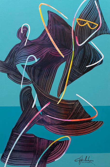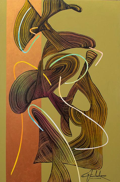 Rustom Cleofe “Ombok” Villamor’s oeuvre is characterized by fascinating abstractions of lifeforms.Theresultingpaintingsareorganicnarratives thatbringouttherichdynamismandenergyoflife. Thisiskeepingwiththeartist’sownexplorationsof nature particularlyhisexperiencelivingonthe shoresofhisnativeSamar.Thepaintingsaremost reminiscentofsea-life adirectlinktotheartist’s roots buttheyalsocelebratethedelightsofother lifeforms.