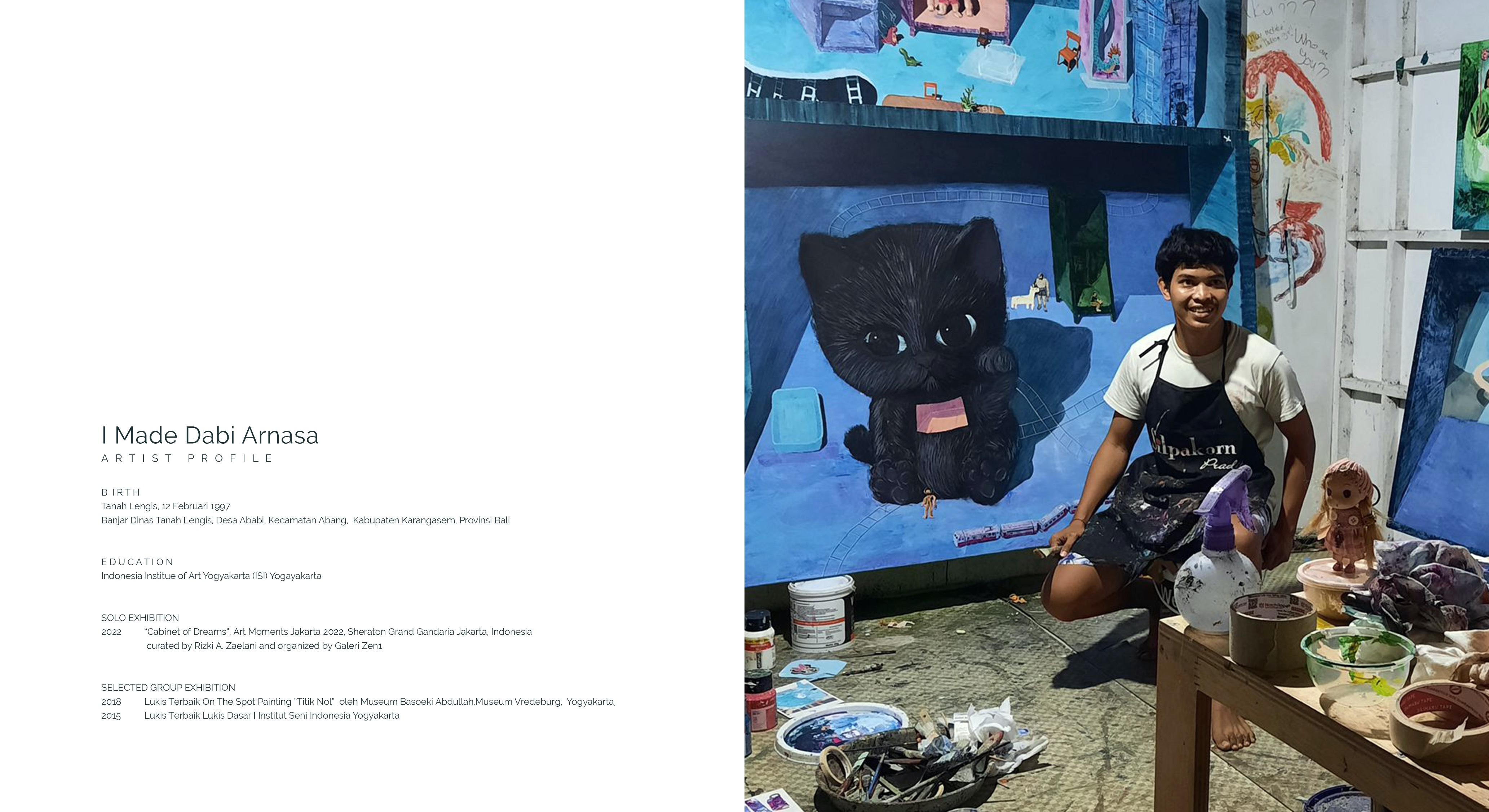 "Cabinet of Dreams" is a solo paintings exhibition by I Made Dabi Arnasa. A young Balinese-born artist who recently graduated from the Indonesian art institute, Yogyakarta, who has been being talked about lately because of his unique talents and surrealistic concepts that are so interesting; painting dreams of his friends, and of course also the dreams that he experienced himself. The exhibition will be held at the grand event Art Moments Jakarta 2022: 4-6 November 2022. The exhibition organized by Galeri Zen1
