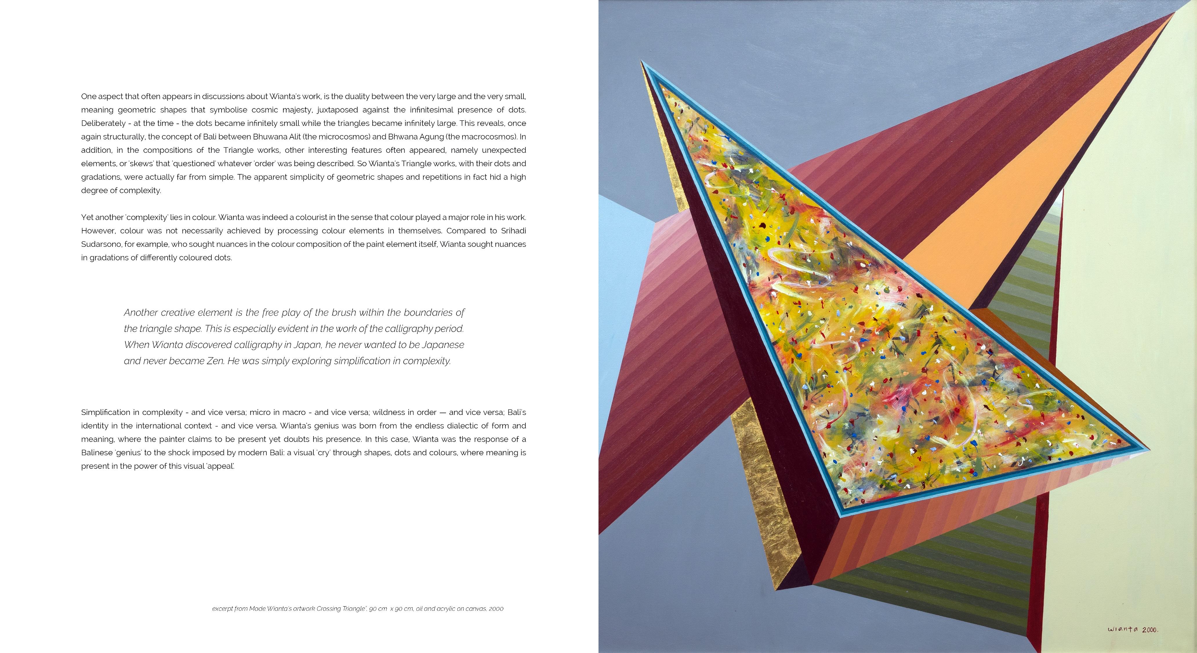 "The Mystery of Flying Triangle" is a solo exhibition of the late maestro painter Made Wianta (Bali, 1949-2020) which was presented specifically at a booth area designed by a group of young Balinese creatives that was presented to the public so that they could not only enjoy Made Wianta's paintings, but also also provide experience entering his work. This exhibition will be held in the atrium area of Gandaria City Mall, Jakarta, 4-6 November 2022
