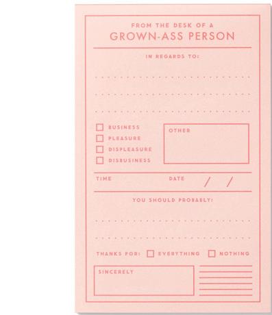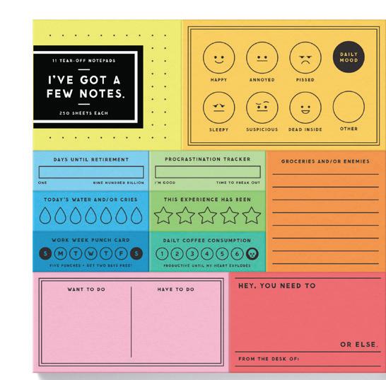 This vintage-inspired tear-off notepad set by Brass Monkey features a collection of 11 separate pads–each designed for its own super-important task. They're perfect for keeping track of your to-do list, your current mood, or just how many times you've cried today–it's easy to lose track.