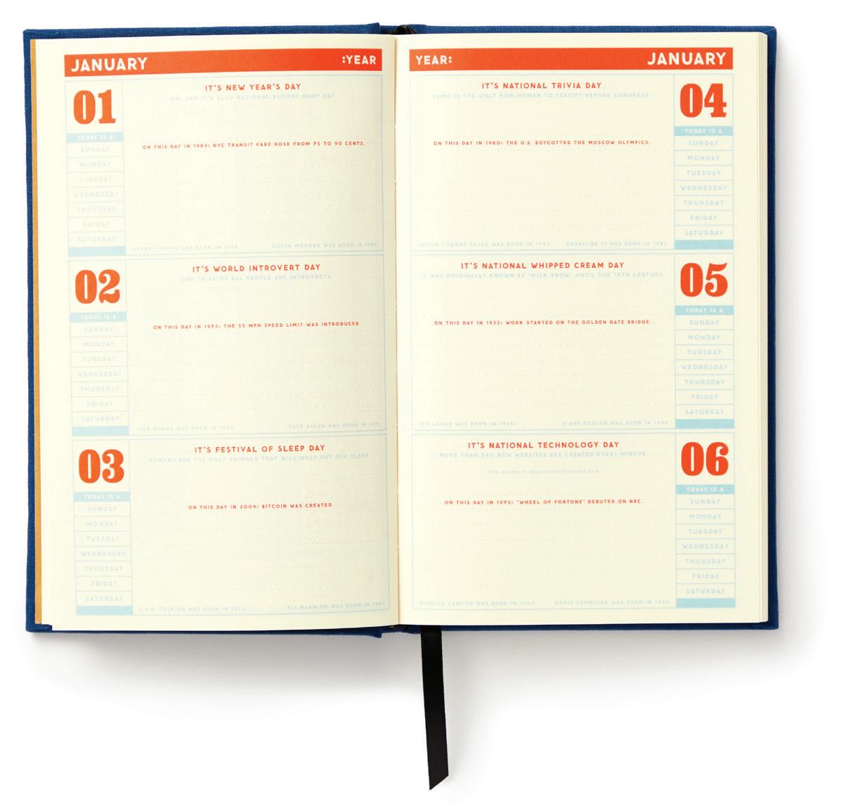 Sure, this planner is technically undated... but that’s really selling it short. It’s more like...‘un-yeared.’ See, we did all of the hard work for you. We’ve already put in all the dates, the fixed holidays, and tons of extra stuff like daily random holidays (like House Plant Appreciation Day, just for an example), celebrity birthdays, and other bits of trivia. All you have to do is fill in the year and what day of the week each day is on. Simple. So if you want, you can buy this planner today and still procrastinate actually using it until 2054...live your life.