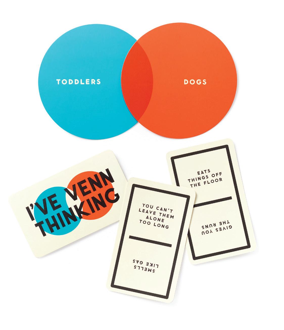 ISBN: 978-0-7353-7703-5 9 7 8 0 7 3 5 3 7 7 0 3 5 I’VE VENN THINKING $22 .00 9780735377035 We have more in common than we all think. In fact, that’s kind of the point of this game. This Venn diagram-based party game is all about finding hilarious similarities between two random (and we mean random) things. Just draw the red and blue discs to create unexpected pairings (like the Month of February and Tom Cruise) and then compete with friends to try to find the funniest thing that they both have in common. • Includes 100 red & 100 blue ‘topics’ to pair, and 520 different pre-written ‘answers.’ OUTER BOX MEASURES 5.8" X 3.7" X 3.5" DEEP I’VE VENN THINKING 3 NEW
