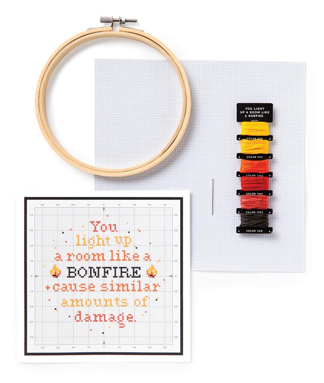 While everyone else is blessing-theirmess, you can stitch out a little dose of reality. This cross-stitch-kit-for-therest-of-us by Brass Monkey includes everything you need (besides the patience): an embroidery hoop, needle, Aida cloth, and all the floss you could possibly want. That’s what they call the thread…you’ll have to provide your own dental care supplies.