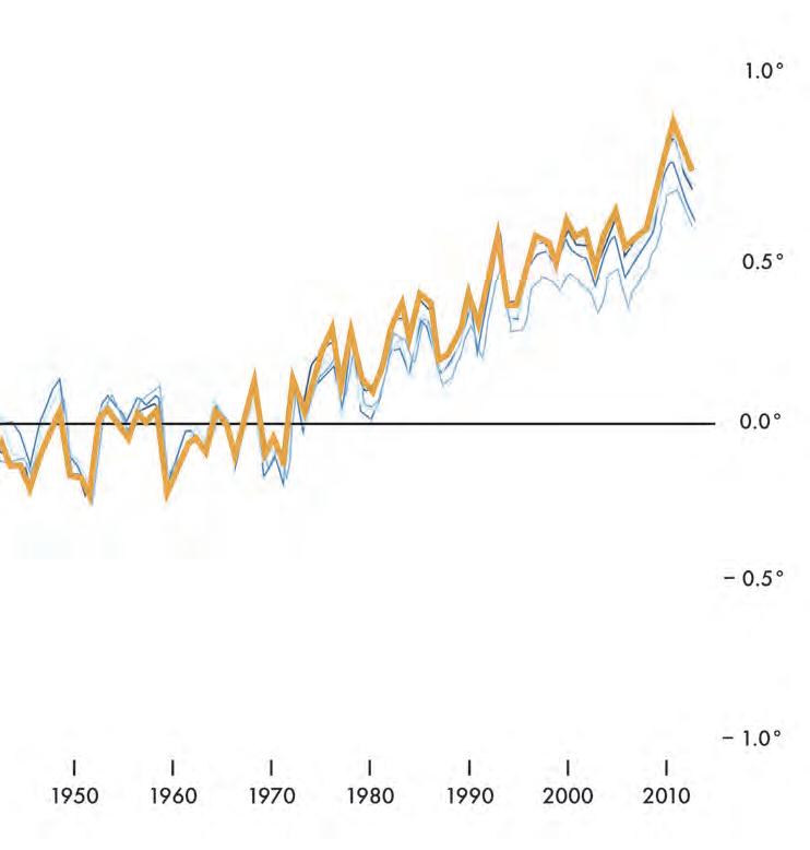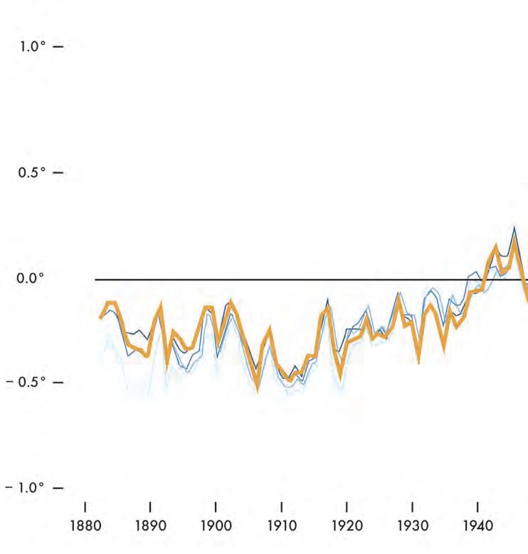 L’insieme delle linee mostra le anomalie nella temperatura rilevata dal 1880 al 2018, rispetto alla media tra il 1951 e il 1980, registrate da NASA, NOAA, Japan Meteorological Agency, Berkeley Earth research group e Met Office Hadley Centre (UK). Tutte le rilevazioni mostrano un riscaldamento rapido nelle scorse decadi, e tutte mostrano che l’ultima decade è stata la più calda.