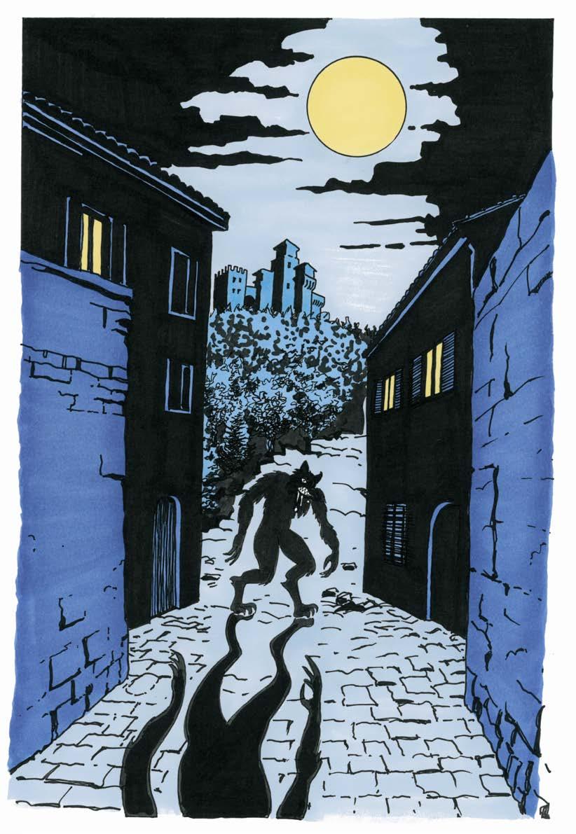 «Una notte qualcuno vide una creatura mostruosa dirigersi verso il castello. Era una specie di enorme lupo, ma stava in piedi sulle zampe posteriori e aveva gli occhi come di vetro, infuocati. I paesani si riunirono nella piazza e, armati di forconi e fiaccole, decisero di raggiungere il maniero che sovrastava il paese. Quando arrivarono, fecero in tempo a vedere il conte che fuggiva nel bosco con una grossa borsa. Da una finestra si affacciò una serva che urlava sconvolta: “È LUI L’UOMO LUPO!” Alle prime luci dell’alba, infatti, aveva visto coi suoi occhi la tremenda creatura trasformarsi nel conte, riempire una borsa con dobloni, pietre preziose e gioielli, e fuggire via.