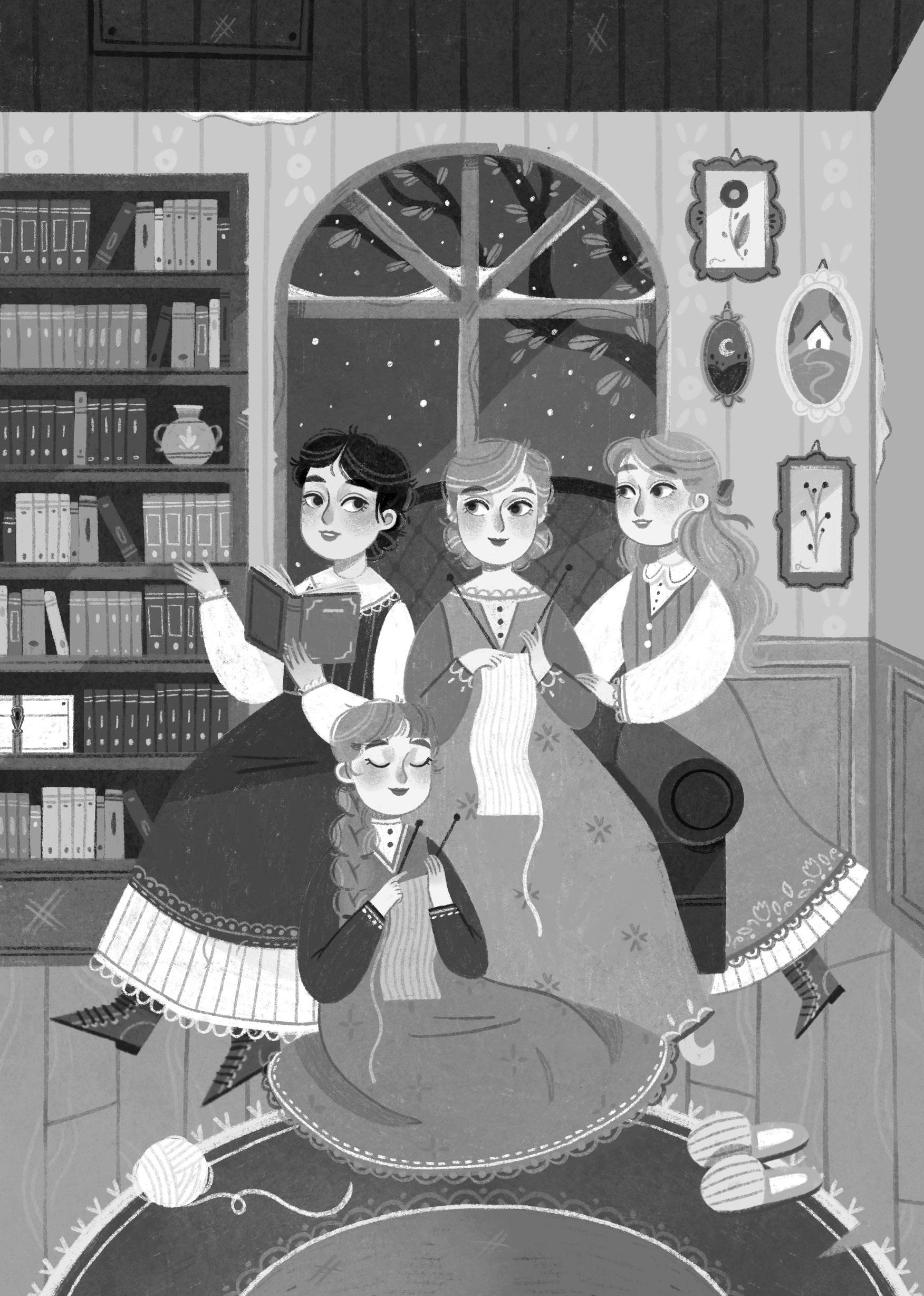 Le parole di Beth rasserenarono gli animi delle ragazze March, intente a sferruzzare sul far della sera davanti al caminetto di casa, mentre fuori cadeva la neve di dicembre, ma i loro sguardi si incupirono subito pensando al padre, cappellano militare, che si trovava lontano a causa della guerra.
