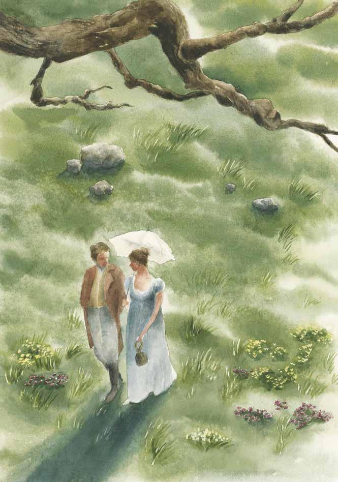 Edward sarebbe rimasto al cottage almeno per una settimana. Qualsiasi altro impegno lo reclamasse, non era infatti una prospettiva possibile dedicare meno di una settimana alla gioia che gli dava la compagnia di Elinor, né quel tempo poteva bastare per dire la metà di ciò che andava detto riguardo al passato, al presente e al futuro… perché sebbene poche ore di intensa e incessante conversazione siano in grado di esaurire più argomenti di quelli che due creature razionali potrebbero mai avere in comune, per gli innamorati è diverso. Tra di loro nessun argomento si esaurisce mai e nessuna comunicazione ha davvero luogo, se non viene ripetuta come minimo una ventina di volte.