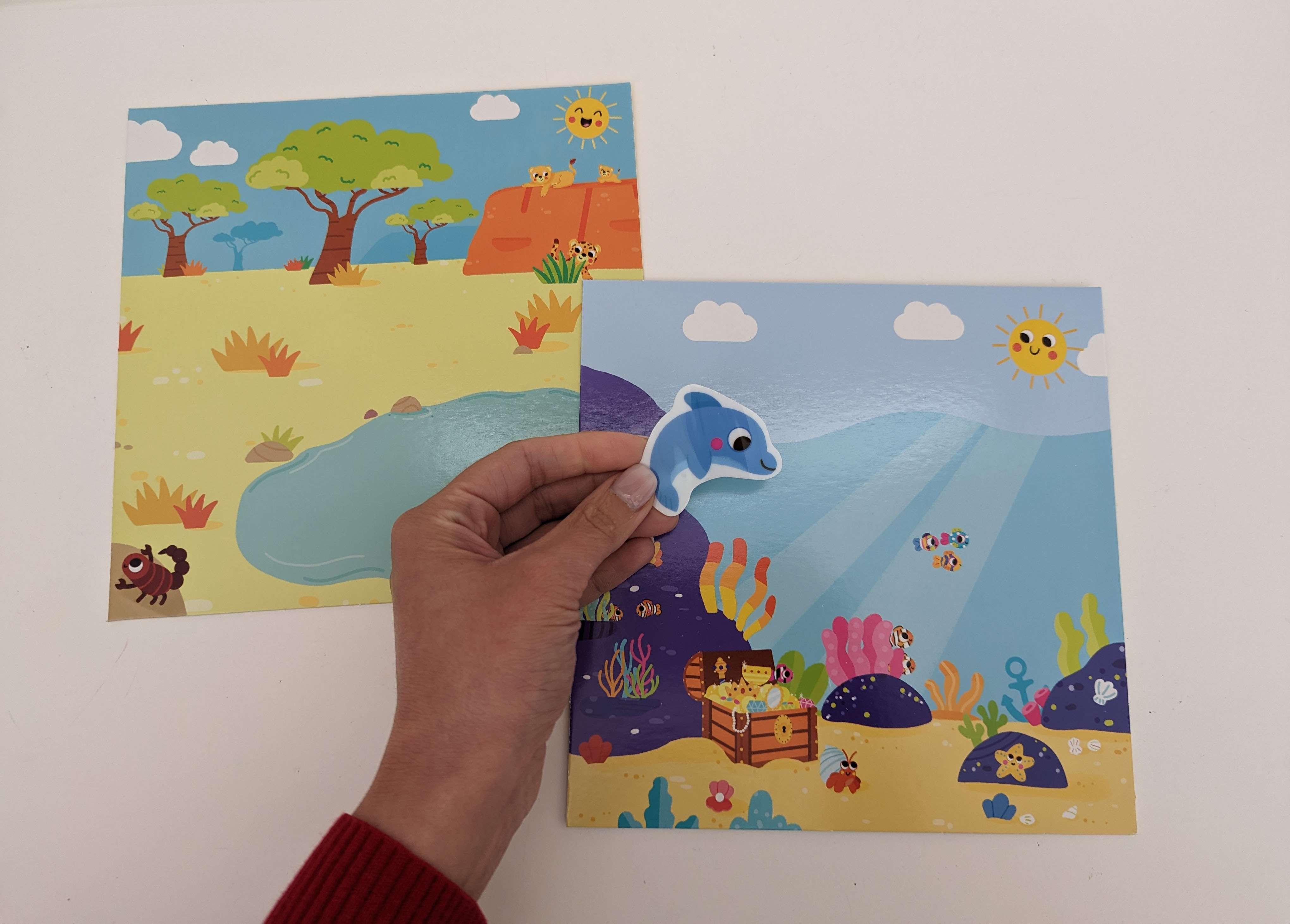 Adesivi spessi, colorati e resistenti da attaccare sull’armadio o sulle piastrelle del bagno… non sporcano e non lasciano traccia! Oppure, puoi posizionarli sui quattro sfondi contenuti nella busta. Attaccali e staccali per creare sempre una scena diversa!
