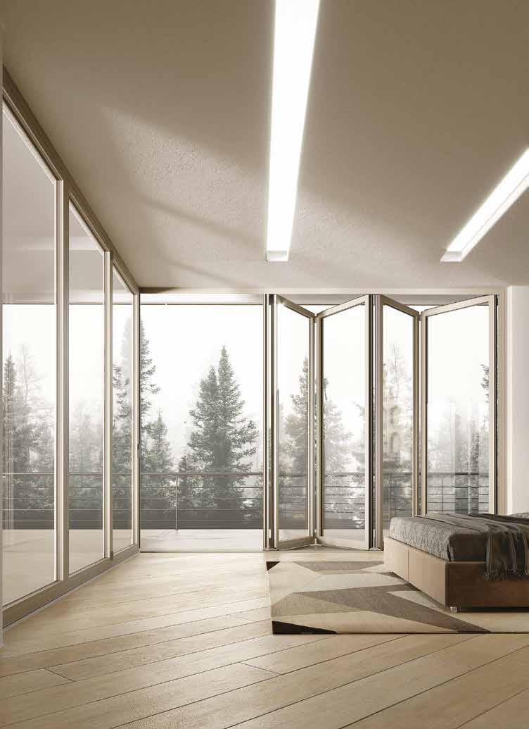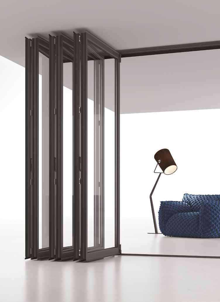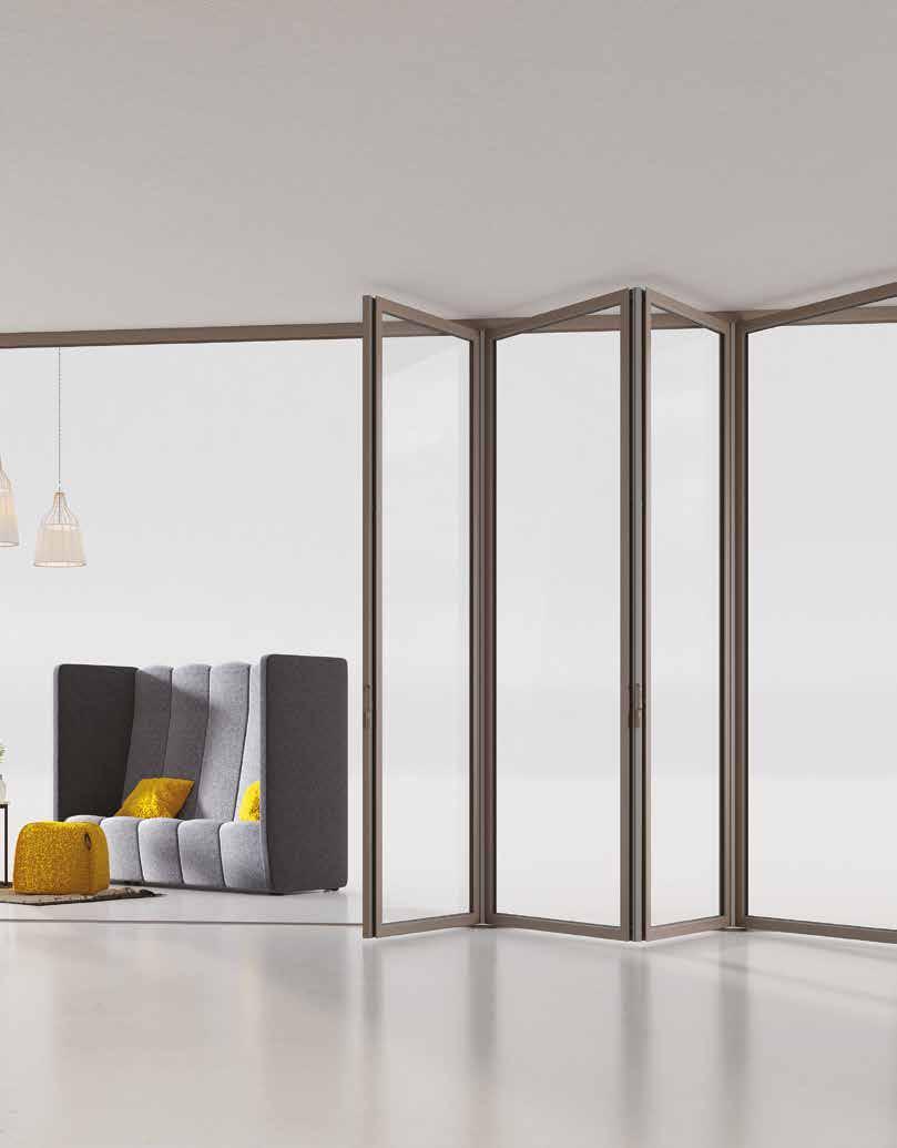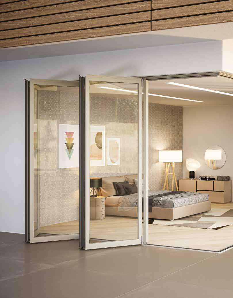vetro si collega alle altre ruotando e raccogliendosi in un pacco laterale, il tutto all’interno di un’unica guida. Questo sistema ti garantisce l’apertura totale della luce naturale, creando un ambiente continuo tra interno ed esterno.