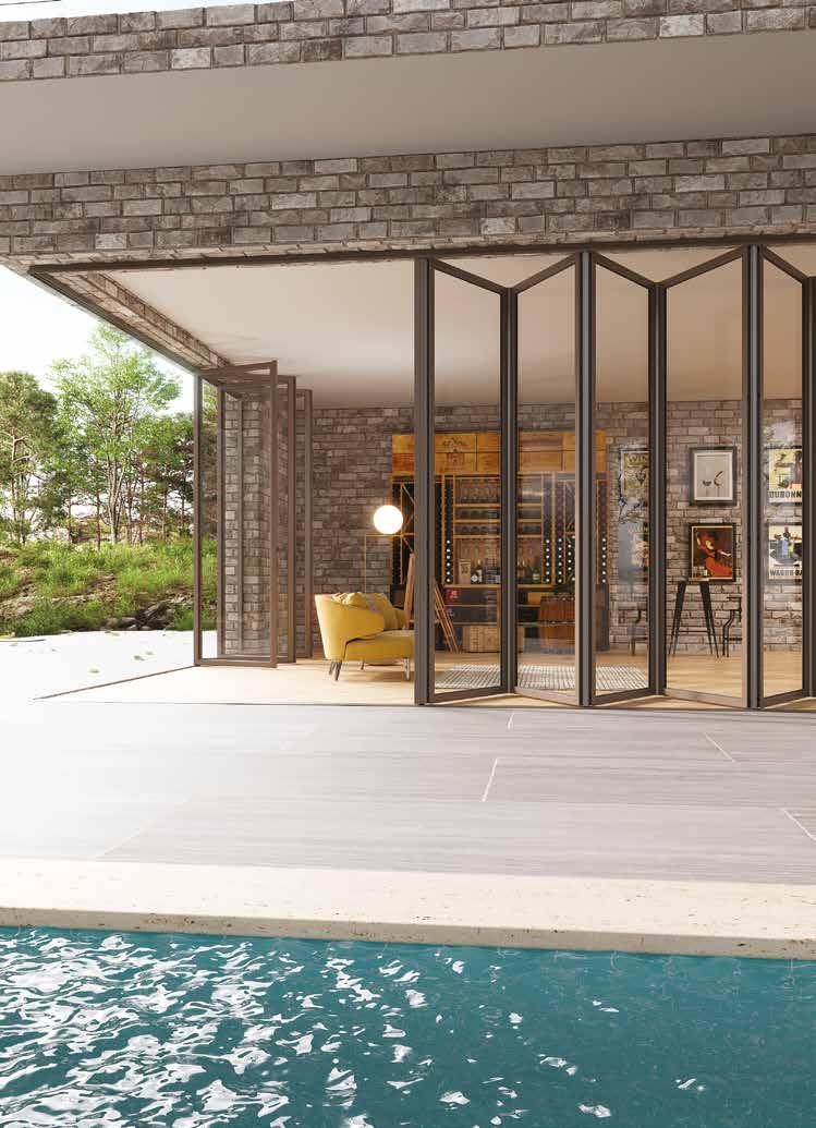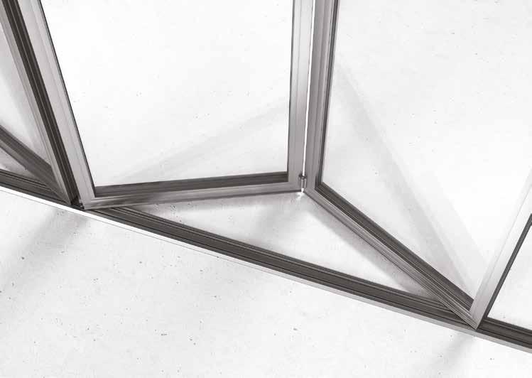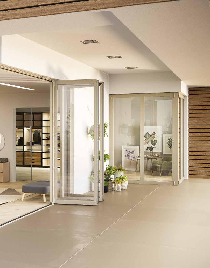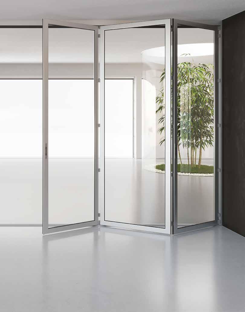 beiden Seiten. Die Faltelemente sind immer maßgefertigt, sodass sich die Verglasung S.60 TT perfekt in die Umgebung einfügen lässt. Die Möglichkeit, eine versenkte Führungsschiene einzusetzen, beschränkt die Erhebung der Schiene im Durchgangsbereich auf ein Minimum.