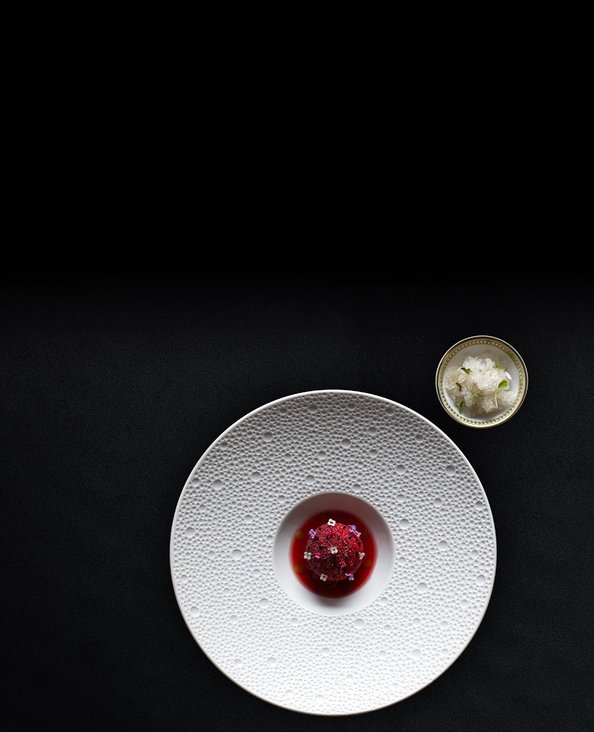 Pour a spoonful of strawberry sauce into the base of the dish, drizzle with the lavender oil and place the sphere in the centre. Decorate with flowers and finish with some mint granita (on the side).
