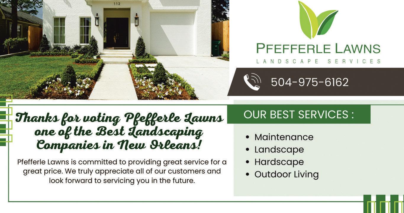 BUL LE TIN BO AR D 4 GA MB IT > BE ST OF NE WO RL EA NS .C OM >S EP TEMBER 25 -O CT OBER 1>2 023 Letourcrewhelpyouwithallyourcleaningneeds! •Disinfecting/SanitationServicesAvailable• •GeneralHouseCleaning• •AfterConstructionCleaning• Residential&Commercial •Licensed &Bonded 504-232-5554 cristinascleaningnola@gmail.com Family owned and operatedsince 1996 CleaningService Cristina’s Licensed in Louisiana LATTER &BLUM |NEW ORLEANS |504.861.7575 504.722.7640 Mobile |pking@latterblum.com TriciaKing.com $920,000 4BED,4.5+BATH, 3,568SQFT ITALIANATE ARCHITECTURE STYLE 2139 MILANST. UPTOWN NEWORLEANS QUINTESSENTIAL LUXURY! NEW! JUST LISTED! Susana Palma RESIDENTIAL •COMMERCIAL AFTERCONSTRUCTIONCLEANING SANITIZING/DISINFECTING LIGHT/GENERALHOUSEKEEPING HEAVY DUTYCLEANING Locally owned &serving the New Orleans area for over 31 years lakeviewcleaningllc@yahoo.com 504-250-0884 504-309-6662 Fully Insured & Bonded CLEANING SERVICE Lakeview KITCHENAND BATH RENOVATIONS •PLUMBING CARPENTRY•ROOF REPAIR ELECTRICAL •DECKS FLOORING •PAINTING SUNSHINEHANDYMAN1.COM 504-248-8798 LIC# 566984 LICENSED ANDINSURED MJ’s METAIRIE SHOPPING CENTER 1513 MetairieRoad•504-835-6099 mjsofmetairie.com MJSMETAIRIE NOW OPEN Mon.-Fri. 10-5& Sat. 10-3 MJ’s MJ’s Novelty Purses $27.99 -$55.99 Lifeistoo short to wear boring purses! INTERIOR/EXTERIOR •Drain Cleaning •Pressure Washing •Sheetrock / Plaster Repairs •New Gutters / Repairs •Patio Covers •Decks •Siding/Fascia &much more! ✁ ✁ ✁ ✁ ✁ ✁ ✁ ✁ ✁ ✁ ✁ ✁ ✁ ✁ ✁ ✁ CALLJEFFREY• (504) 610-5181 • SOIL • GRAVEL • BOULDERS • LIMESTONE 9119 AIRLINE HWY, NOLA 504.488.0908 • FLAGSTONE • MULCH • MEXICAN BEACH PEBBLES Easy online ordering at rocknsoilnola.com ADVERTISE WITH US Call Sandy Stein (504) 483-3150 or sstein@gambitweekly.com ForRent -3122Palmyra St 1bdhalfdbl.Wood floors,kitchen appliances,wash/dry,ceilingfan.water paidfor $950/mo+deposit. Call504-452-2056 Immigration. Criminal Law. Traffic Tickets CallEugeneRedmann504.834.6430 2632AthaniaPkwy.,Met., LA 70002 Se Habla Espanol www.redmannlawnola.com