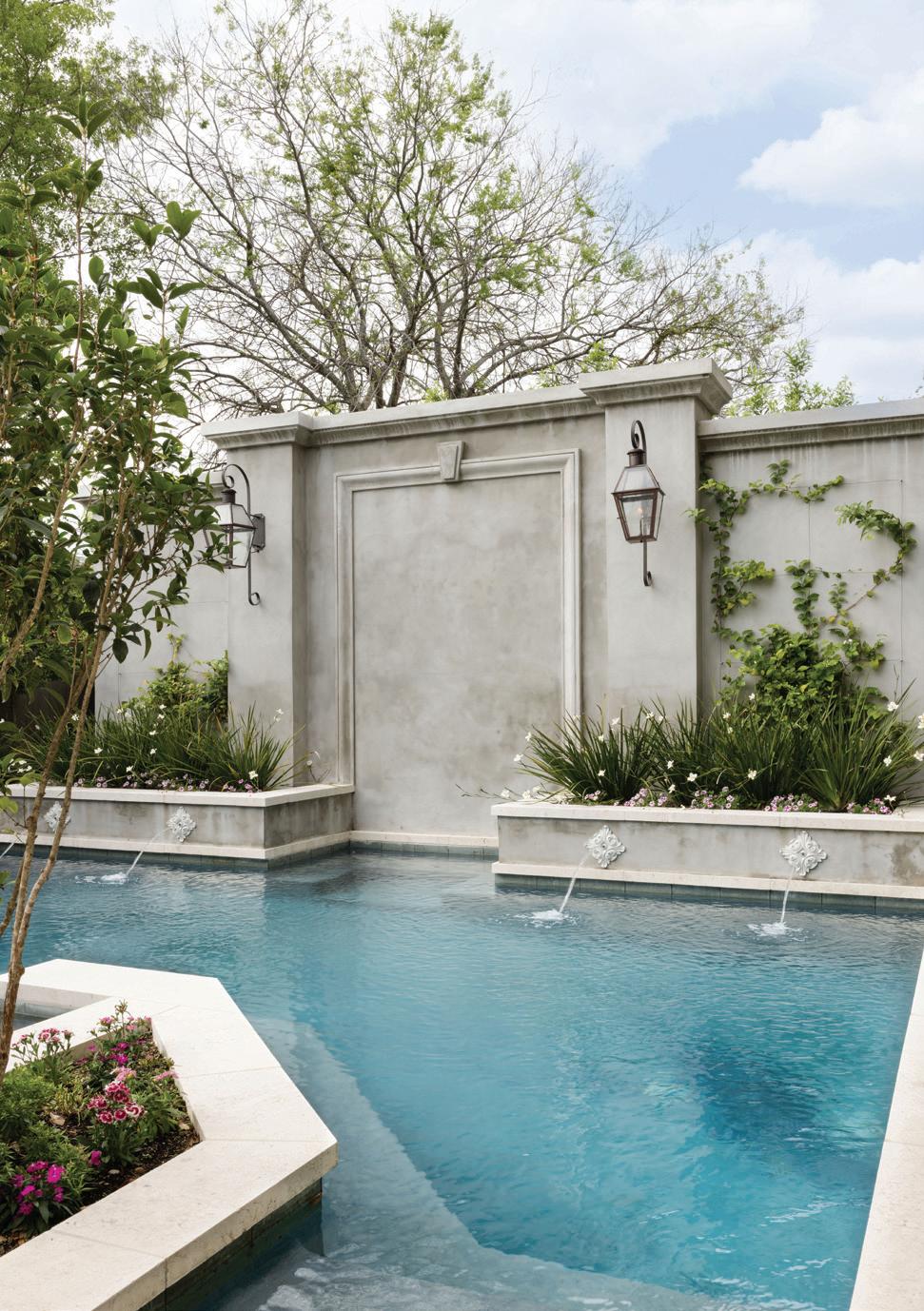 detailed wall featuring Bevolo lanterns is as functional as it is pretty. Against the wall is a swim out seating area, created as an underwater “living room” with a view back to the house. Behind it lies hidden storage for pool equipment and toys, the A/C units, and a shower with frost-proof tile from Floor and Decor and a male holly hedge for additional privacy. “What’s really terrific is that when you enter the house now and look at the pool through the big guillotine window, your eye believes the house extends to the wall,” Lesley said. “It looks as if the house is two times its size.”