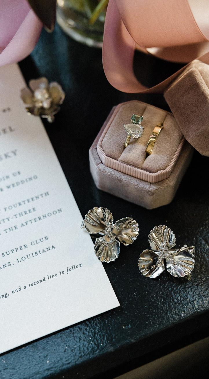 The couple, who now call Lisbon, Portugal home, knew they wanted to plan their wedding in Sabrina’s hometown with an intimate gathering of friends, a Jewish ceremony with a chuppah to honor Adam’s family, and Filipino-inspired touches to honor Sabrina’s heritage. They found a perfect quaintness and intimacy at Mosquito Supper Club, a bespoke sustainable seafood restaurant on Dryades Street. The ceremony was held on the front porch followed by a Cajun family-style dinner inside and dancing in the backyard. “We originally reached out to Mosquito Supper Club to inquire about a rehearsal dinner,” Sabrina said. “Their food and mission felt very special to us.”
